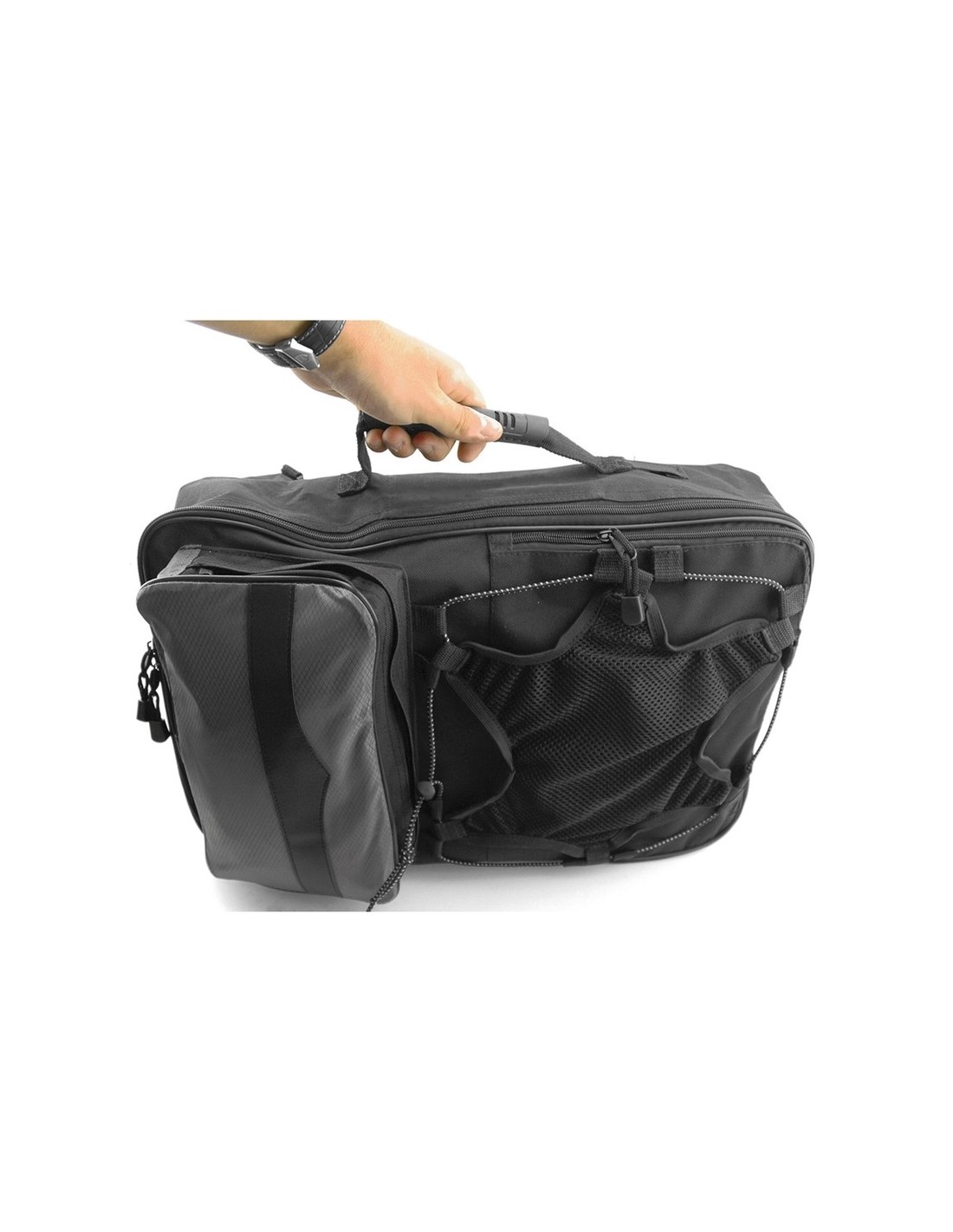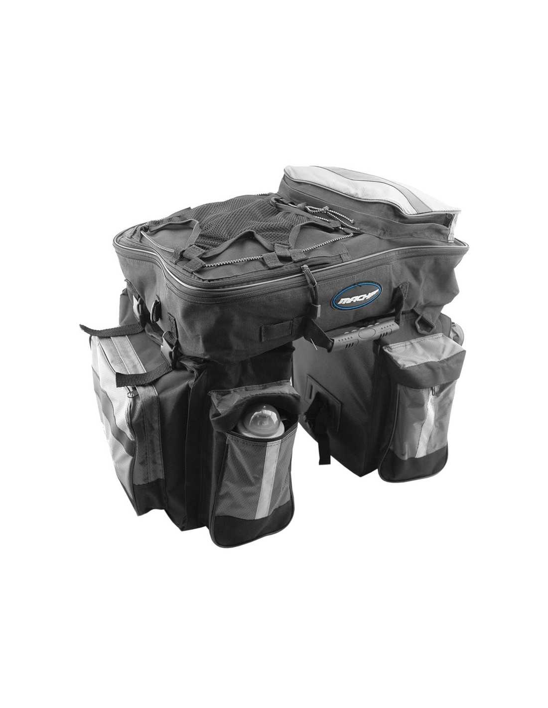 Alforja bicicleta Oversize. Extrareforzada. Capacidad Aprox: 64L Medidas totales: H:50cm, A:61cm, F:40cm / Peso: 1,8Kg. Sujeción al portabulto trasero. 3 bolsas en 1. Fabricada en cordura con costuras de alta resistencia. - 10 compartimentos. - 3 Modulos totalmente independientes. - Red superior. - Desmontaje rápido de clip. - Cordón superior para mosquetones, etc... - Franjas reflectantes. - 2 bolsillos portabidones con cremallera. - 2 Asas de transporte. - Uso como mochila. El problema del espacio está resuelto, aquella larga ruta que siempre quiso hacer, ahora es posible con esta nueva alforja modulable.