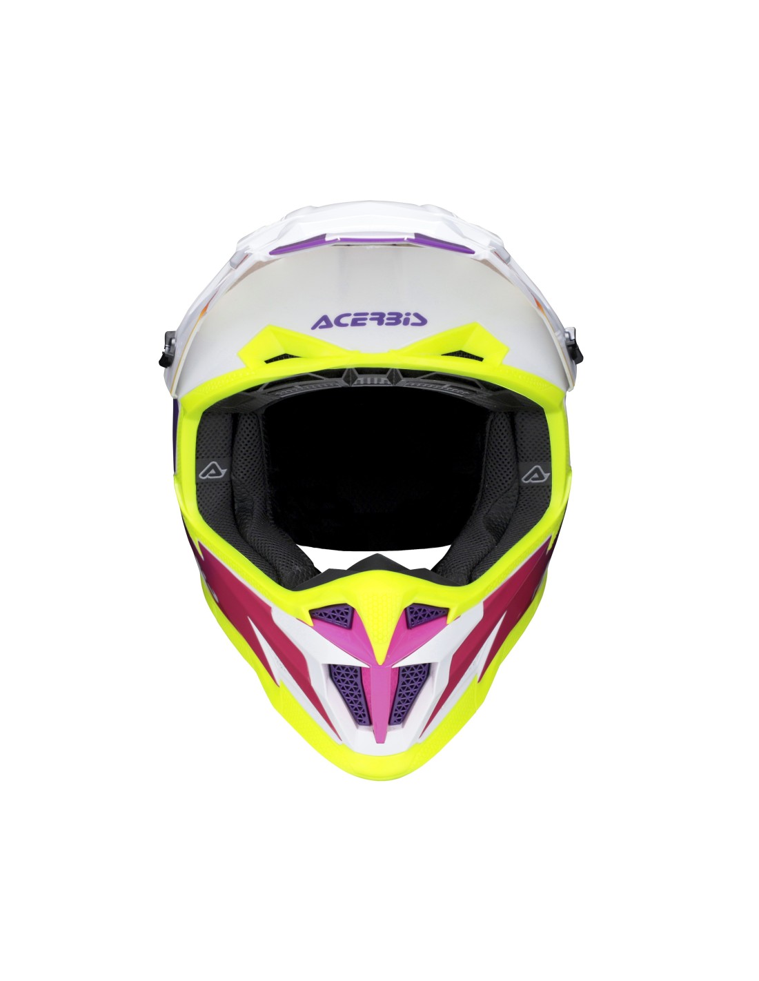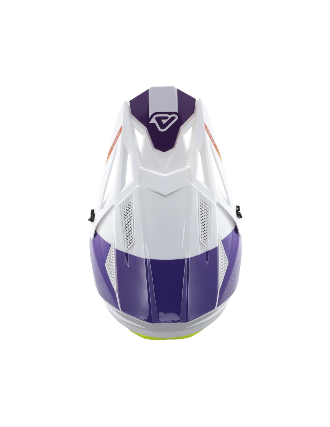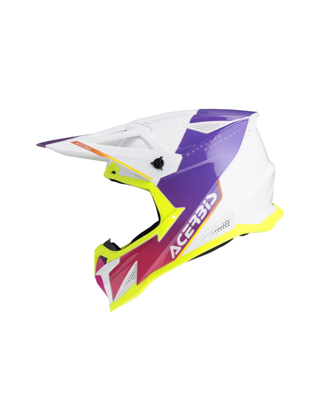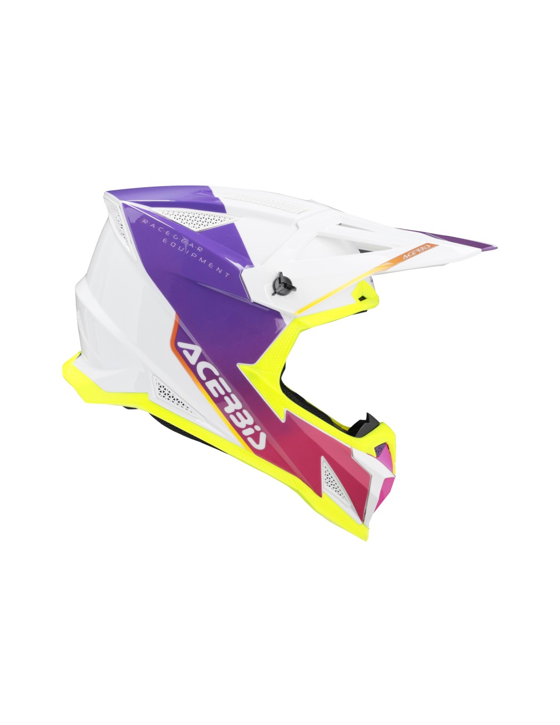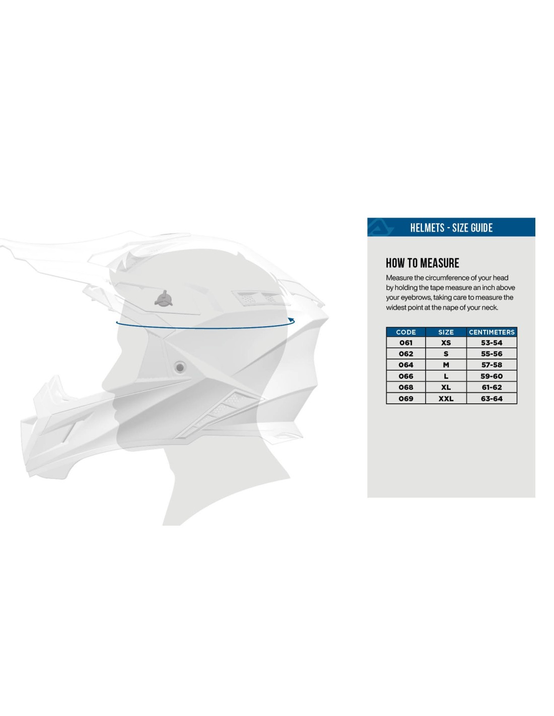 Casco fabricado en fibra con una doble calota exterior y una calota completa que garantizan ligereza y rigidez al producto. La visera con longitud ajustable, en la parte final, fruto de una cuidadosa colaboración entre el equipo técnico y los pilotos, ha permitido garantizar un menor impacto del barro en la máscara durante la carrera. Las 18 entradas de aire del casco aseguran un excelente flujo de aire para lograr una excelente transpirabilidad. Todo esto ayudado por el sistema soft touch que asegura una alta evacuación de la humedad. La provisión del sistema de hidratación permite al piloto un consumo constante de agua incluso durante las vueltas más largas.