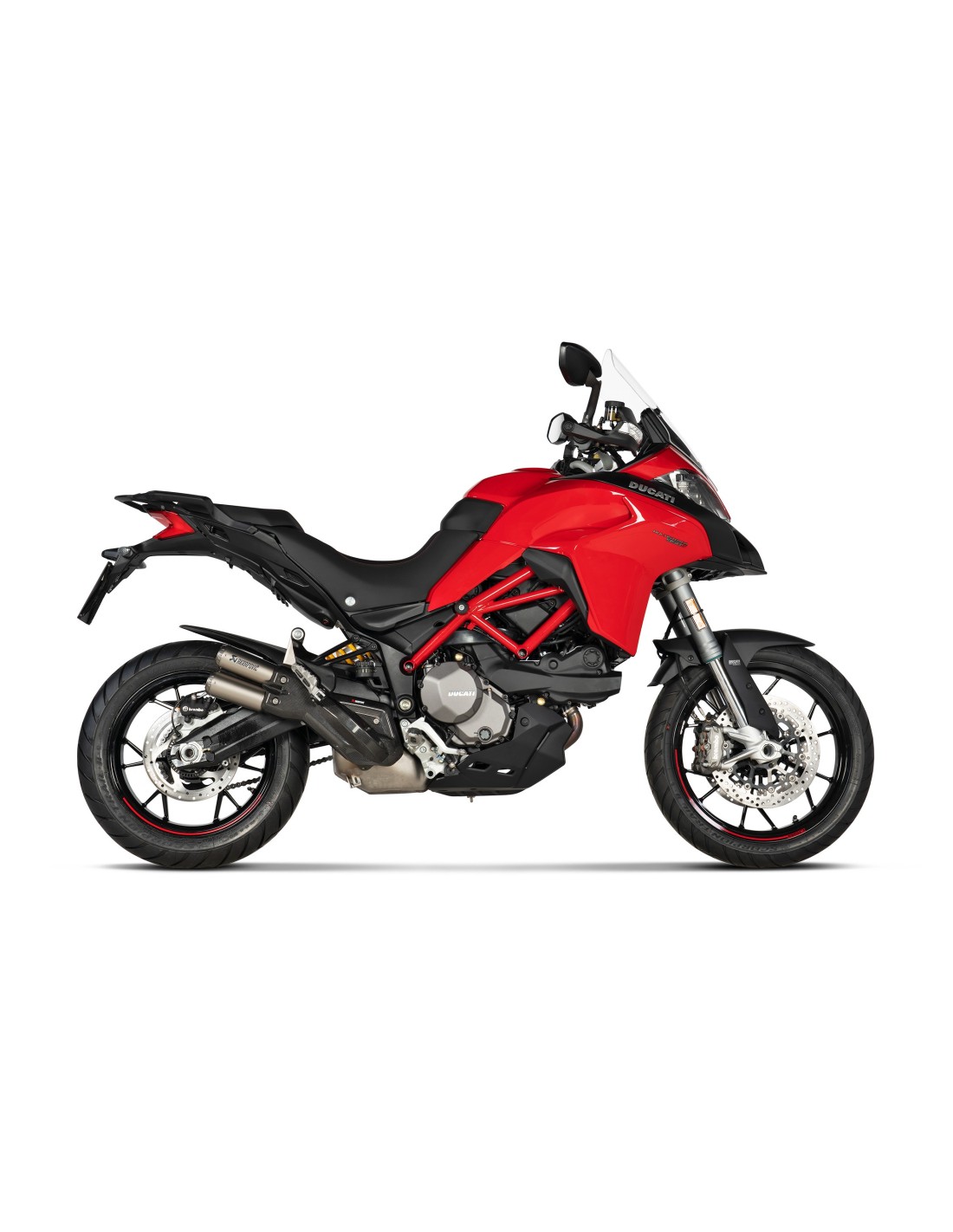El sistema de escape puede equiparse con maletas laterales y caballete central Ducati.