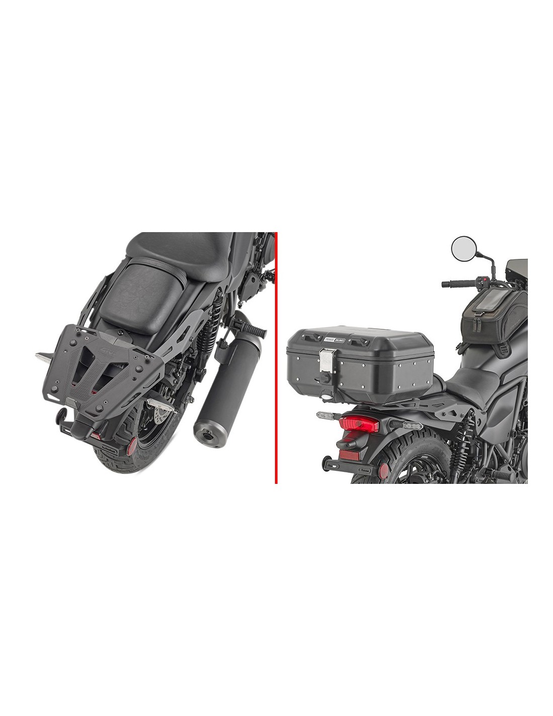 Portaequipajes trasero específico para maletas superiores MONOKEY® o MONOLOCK®, compatible con las placas MONOKEY® M5, M7, M8A, M8B, M9A, M9B o M10, o con las placas MONOLOCK® M5M o M6M, o con la placa incluida en las maletas superiores MONOLOCK®, o con el soporte de aluminio para bolsas EX2M. La combinación con las placas M8A, M8B, M9A y M9B no permite la instalación de un kit de luz de freno ni de un dispositivo para la apertura remota de la maleta.