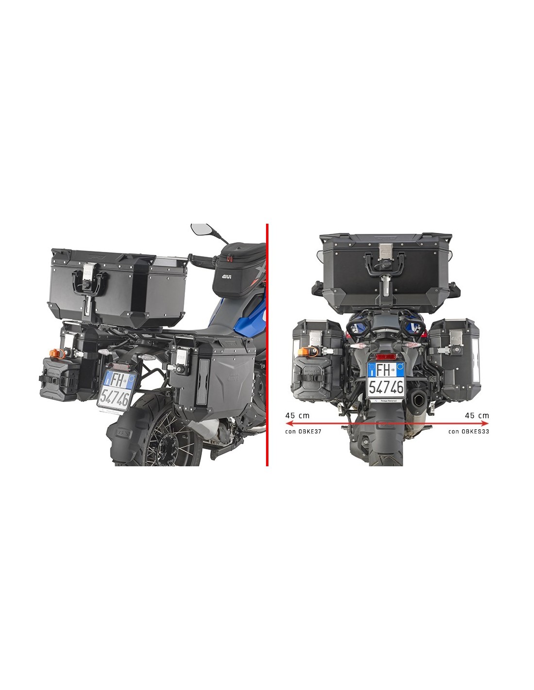 No se puede montar en presencia del sistema de fijación de maletas laterales original / tubular de 18 mm de diámetro / el lado derecho solo es compatible con las maletas con muescas OBKEVS33, OBKEVS40 / se combina con el 13RKIT para la transformación en un portamaletas de liberación rápida