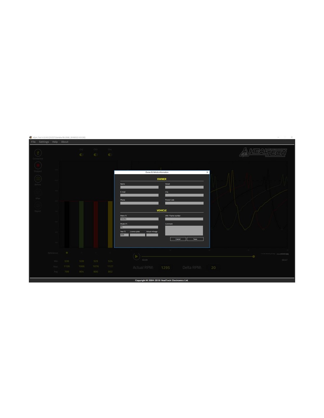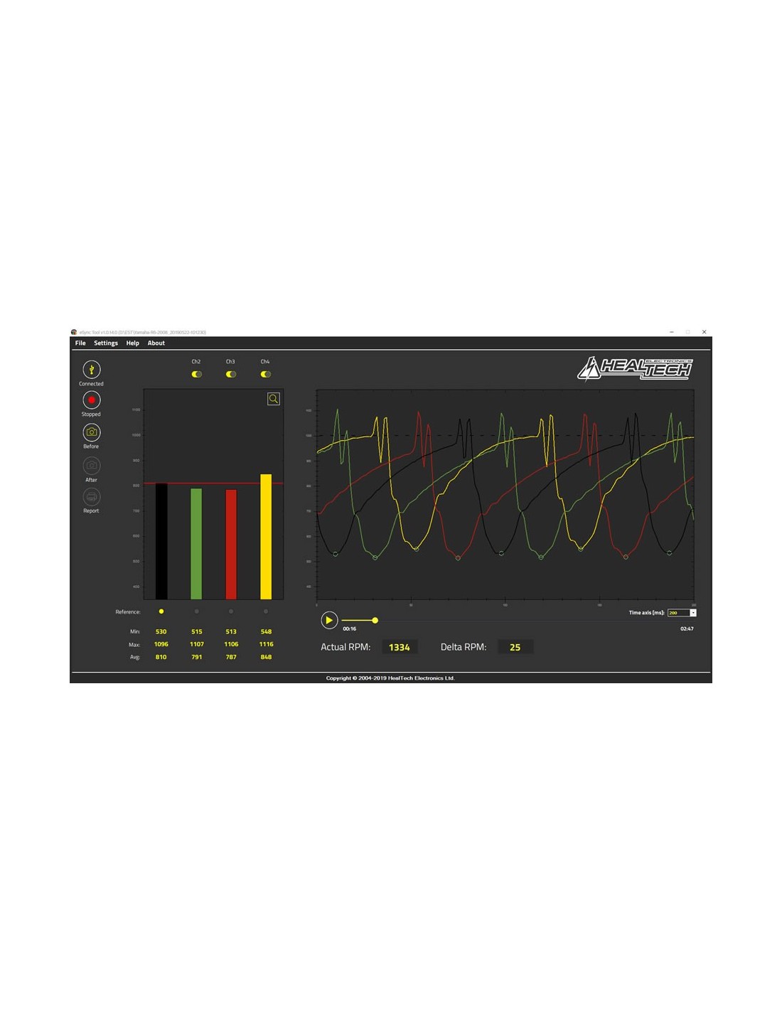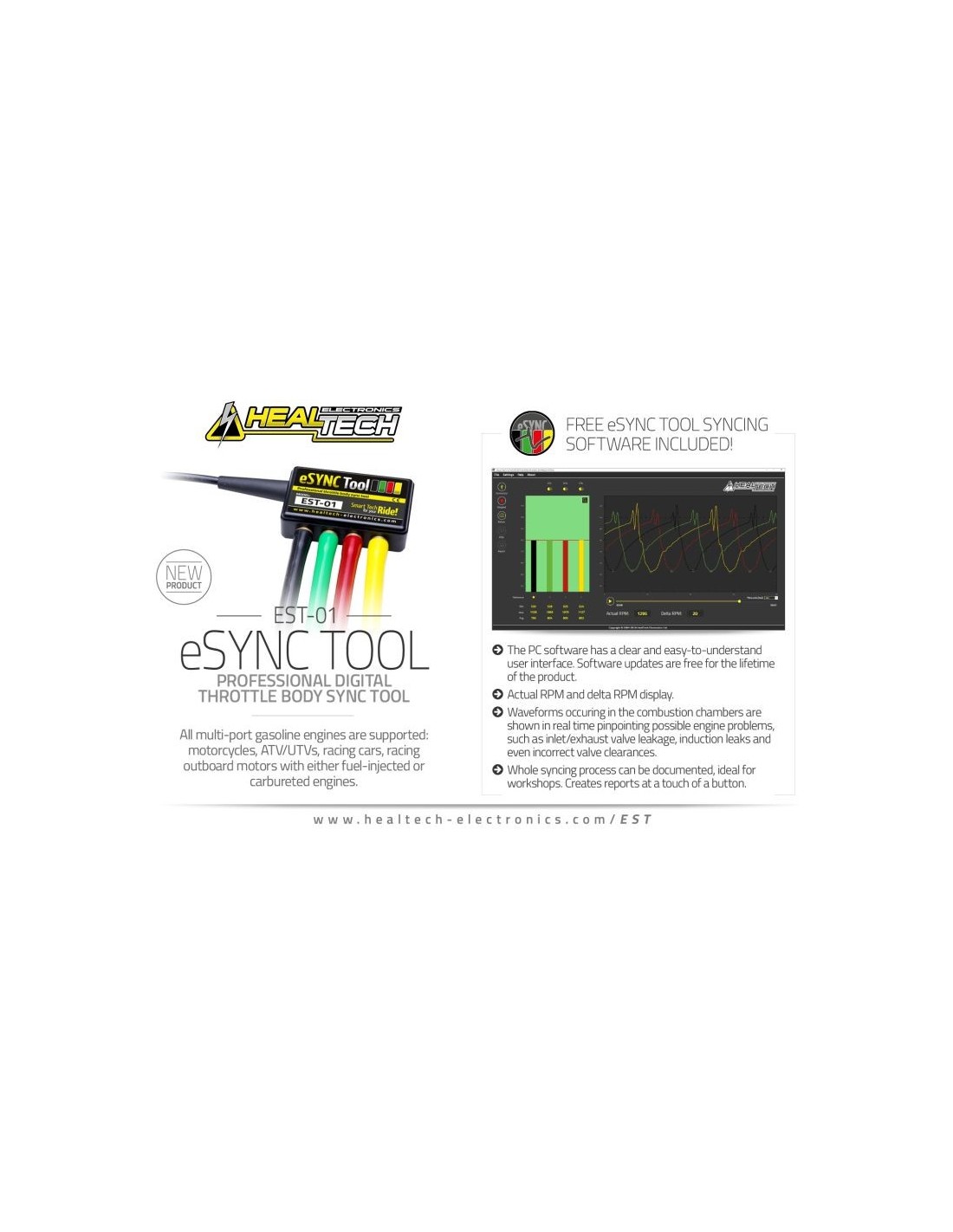El Healtech eSync tiene cuatro canales de medición y no solo proporciona mediciones precisas, sino que también puede mostrar la forma de onda de pulso/vacío en cada cilindro para solucionar problemas complicados.