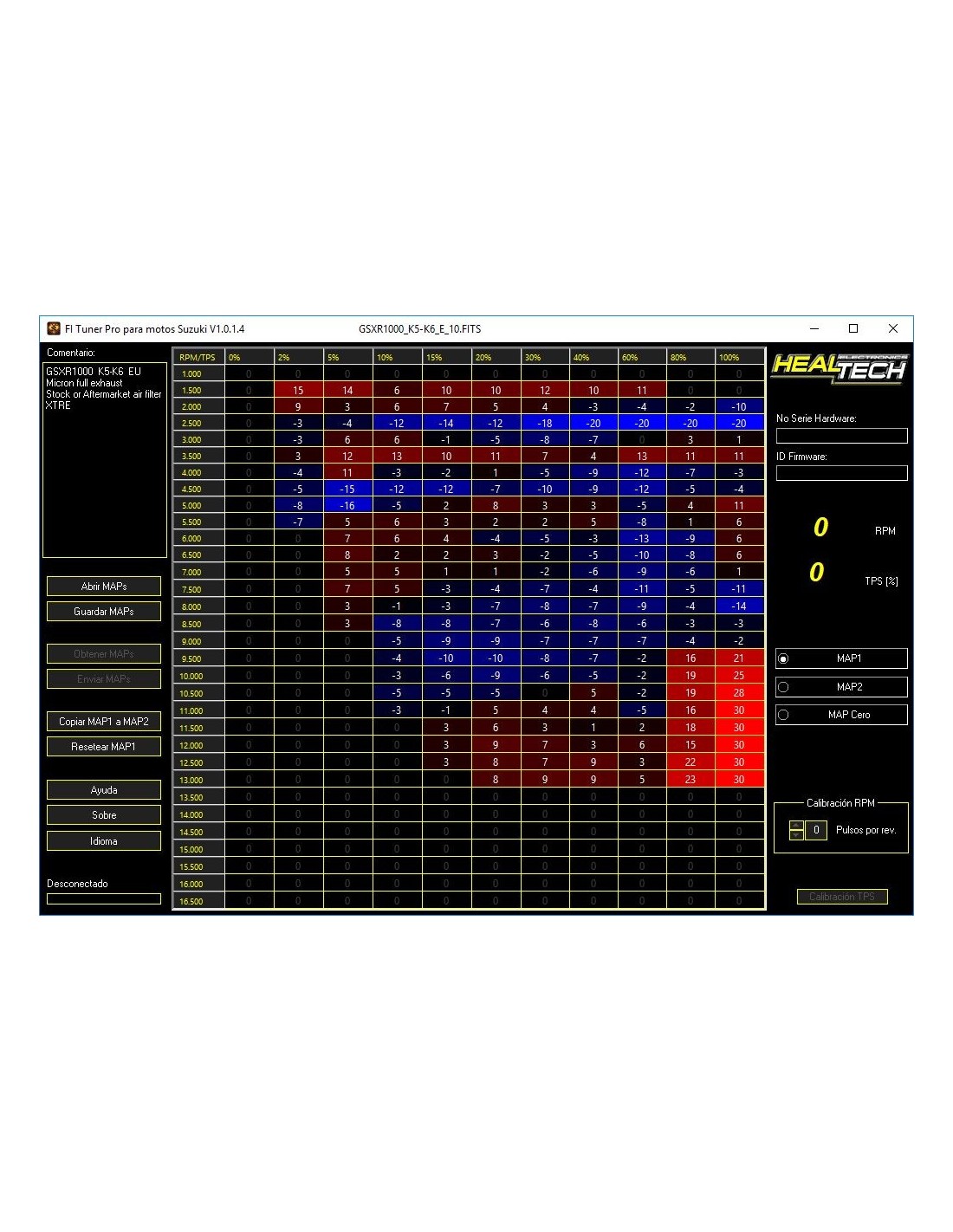 Aunque lo ideal sería diseñar un mapa específico para tu moto usando un banco de pruebas con un analizador de gases, hay mapas facilitados por el fabricante, Healtech Electronics.