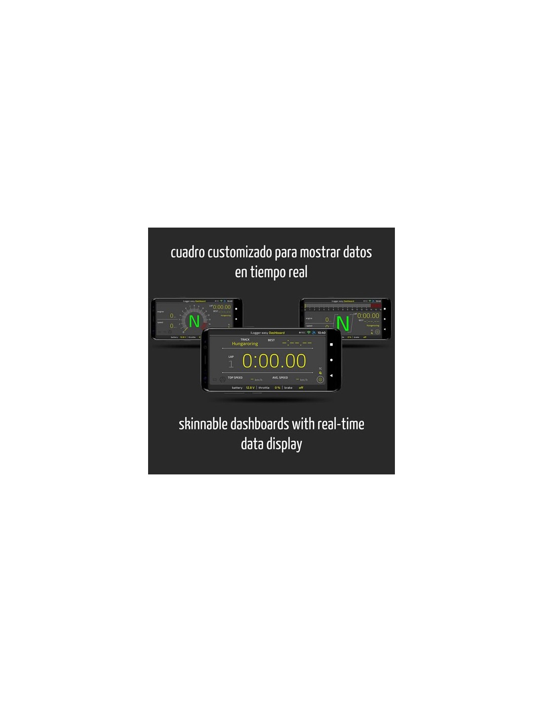 Hay varios "Skins" de tablero disponibles para adaptarse a la mayoría de los gustos, como el cronómetro de vueltas, la indicación de RPM/marcha y carreras de aceleración. Las "skins" personalizadas están disponibles bajo pedido.
