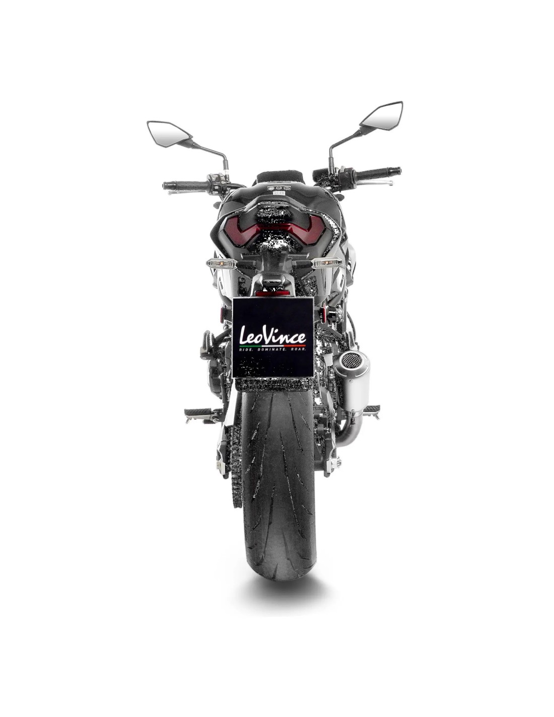 El logotipo LV grabado con láser realza la exclusividad de tu escape y el acabado mate arenado ofrece el inconfundible aspecto titanio de LeoVince.