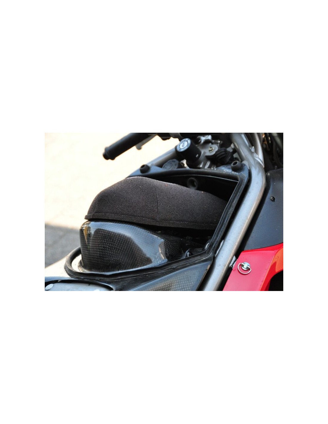 Filtro de aire MWR Performance para modelos 748Bip./S/SP/SPS, 916Bip./S/SP/SPS y 996Bip. & S. Quite el filtro dentro de los tubos de aire y también la malla de protección en frente de los tubos de aire para experimentar el verdadero sistema Ram-Air de esta motocicleta. Coloque el filtro sobre los Velocity Stacks, asegúrese de que el material de espuma esté en el mismo lugar que los stacks. La jaula del filtro permite que el material del filtro sea succionado hacia las entradas, vea la foto.