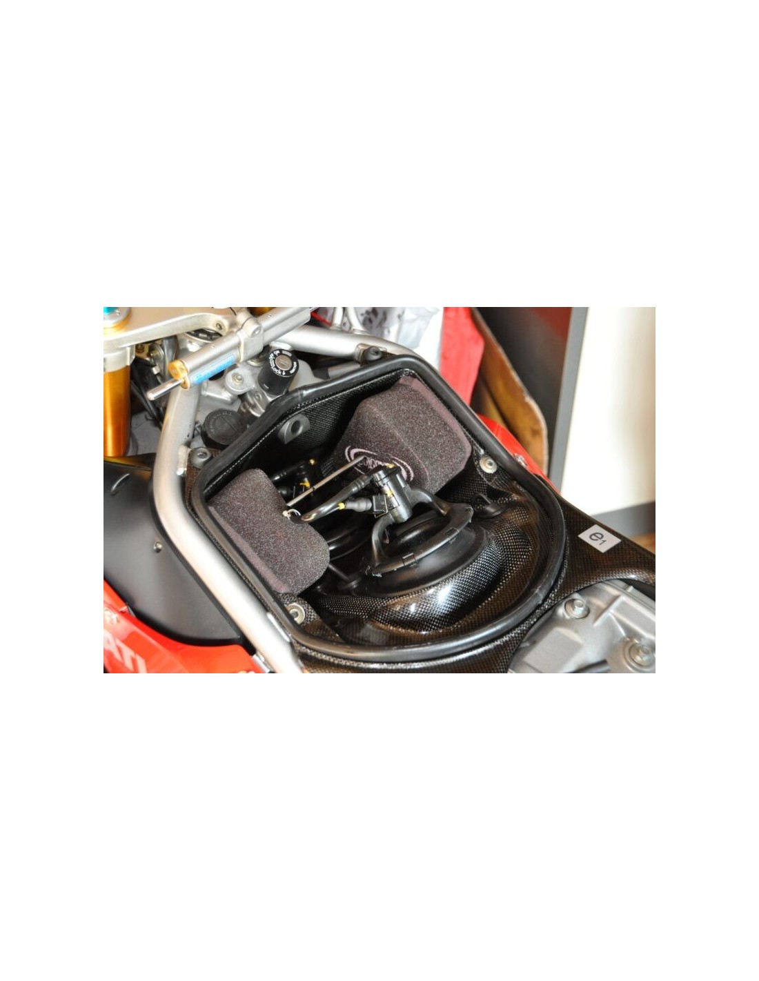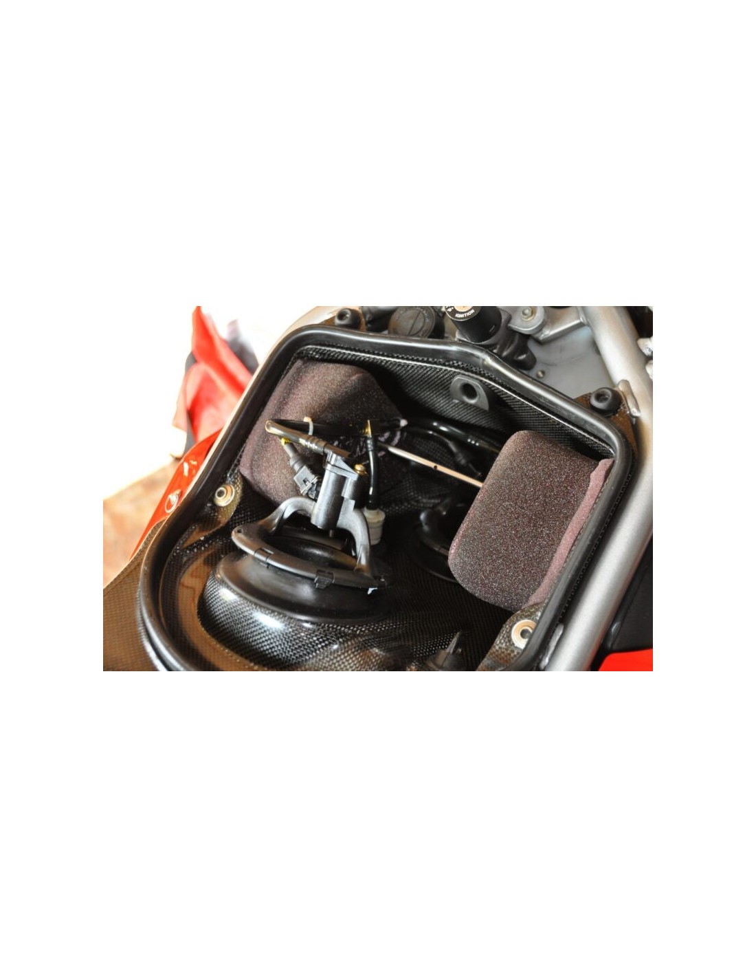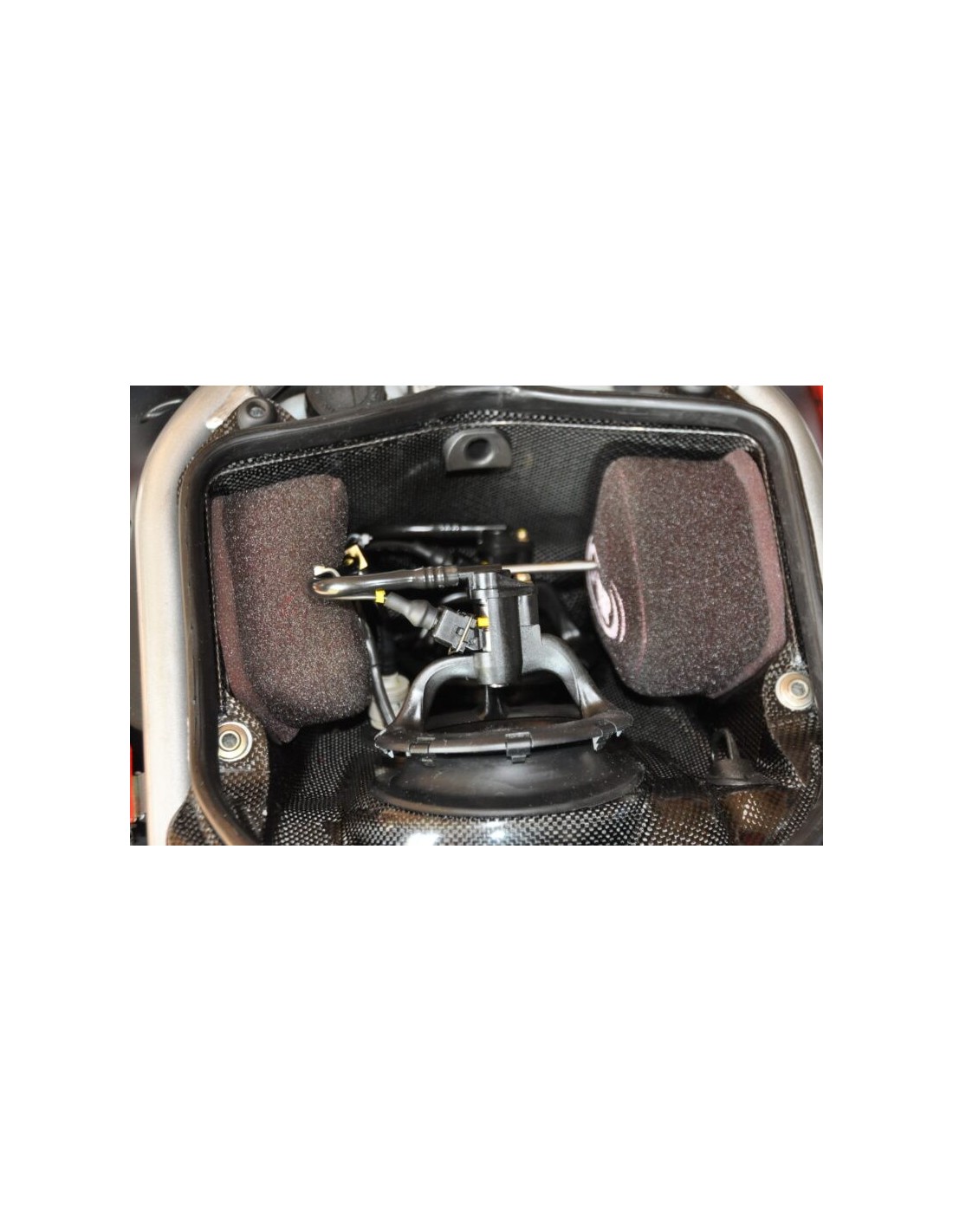 Filtro de aire MWR Performance para 996R / 998bip. / 998S / 998R. Quite el filtro dentro de los tubos de aire y también la malla de protección delante de los tubos de aire para experimentar el verdadero sistema Ram-Air de esta motocicleta. Los filtros están colocados en el mismo lugar que los originales, solo que MWR usa una varilla para atornillar ambos filtros en su lugar y apretarlos. Ver fotos