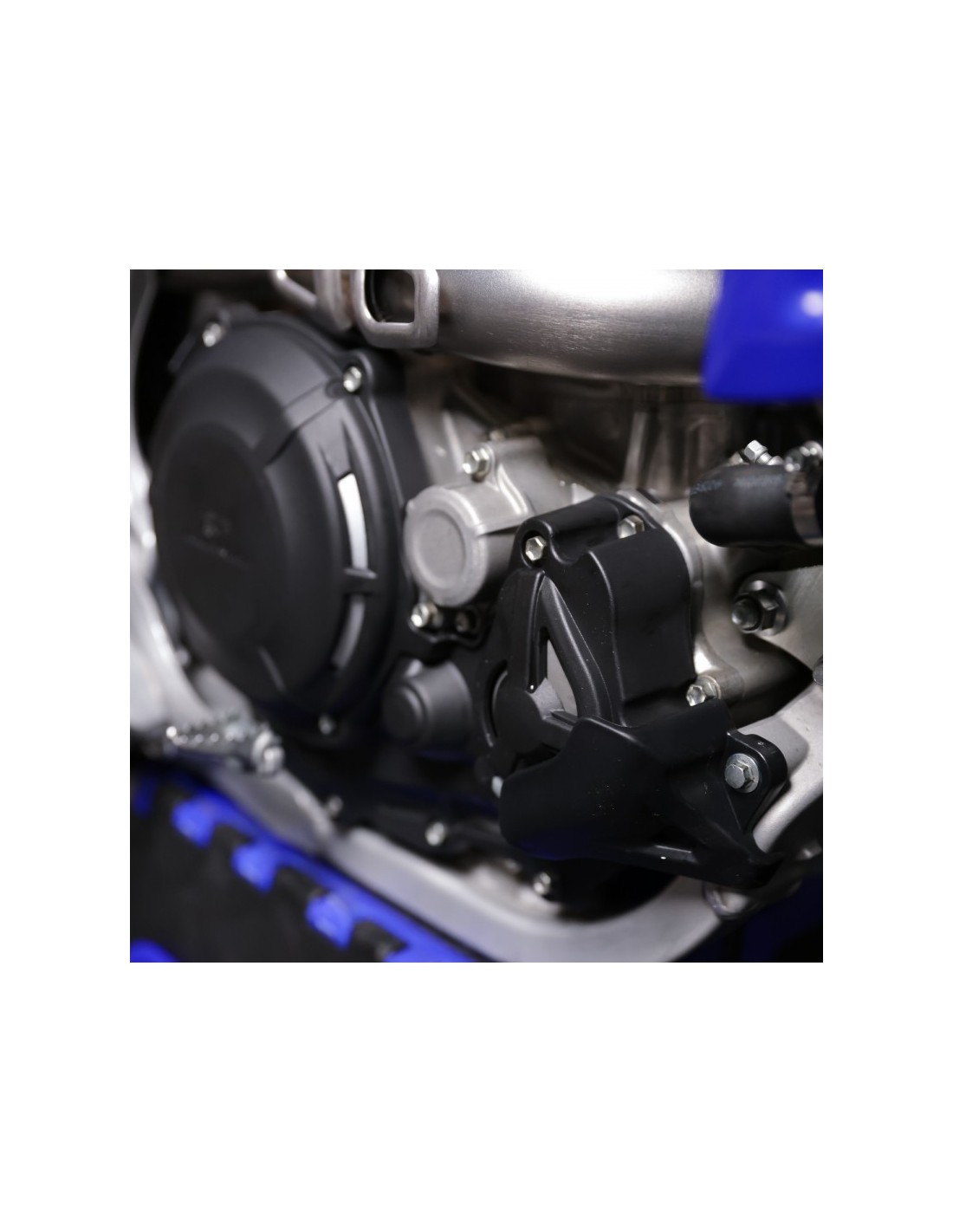 El kit incluye dos protecciones: una pieza que protege tanto la tapa del embrague como la de la bomba de agua y otra para la tapa del encendido. Estas cubiertas han sido diseñadas para permitir el flujo de aire adecuado para refrigerar la zona protegida. Es fácil de montar, utilizando los tornillos originales de la moto.