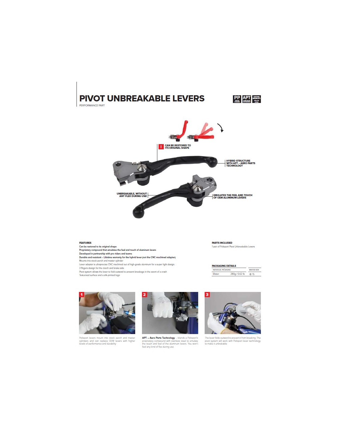 Polisport ha desarrollado esta gama de manetas durante los últimos años/ en colaboración con pilotos profesionales y guerreros de fin de semana para satisfacer sus necesidades y alcanzar la sensación que buscan en una maneta.