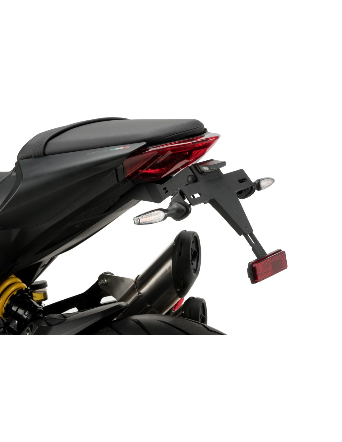 Sustituye el portamatrículas original de tu moto por el soporte porta matrículas de Puig, que gracias a su ubicación elevada confiere un aspecto deportivo a tu motocicleta.