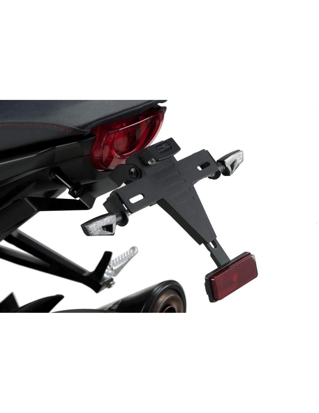 Sustituye el portamatrículas original de tu moto por el soporte porta matrículas de Puig, que gracias a su ubicación elevada confiere un aspecto deportivo a tu motocicleta.