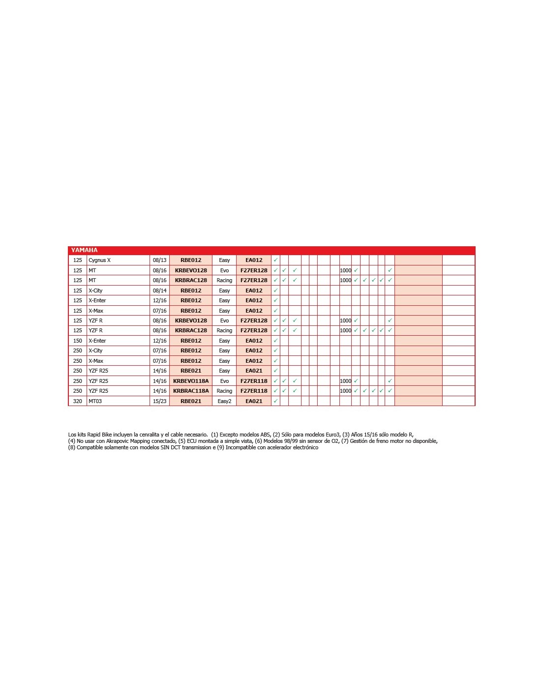 Los kits Rapid Bike incluyen la cenralita y el cable necesario. (1) Excepto modelos ABS, (2) Sólo para modelos Euro3, (3) Años 15/16 sólo modelo R,