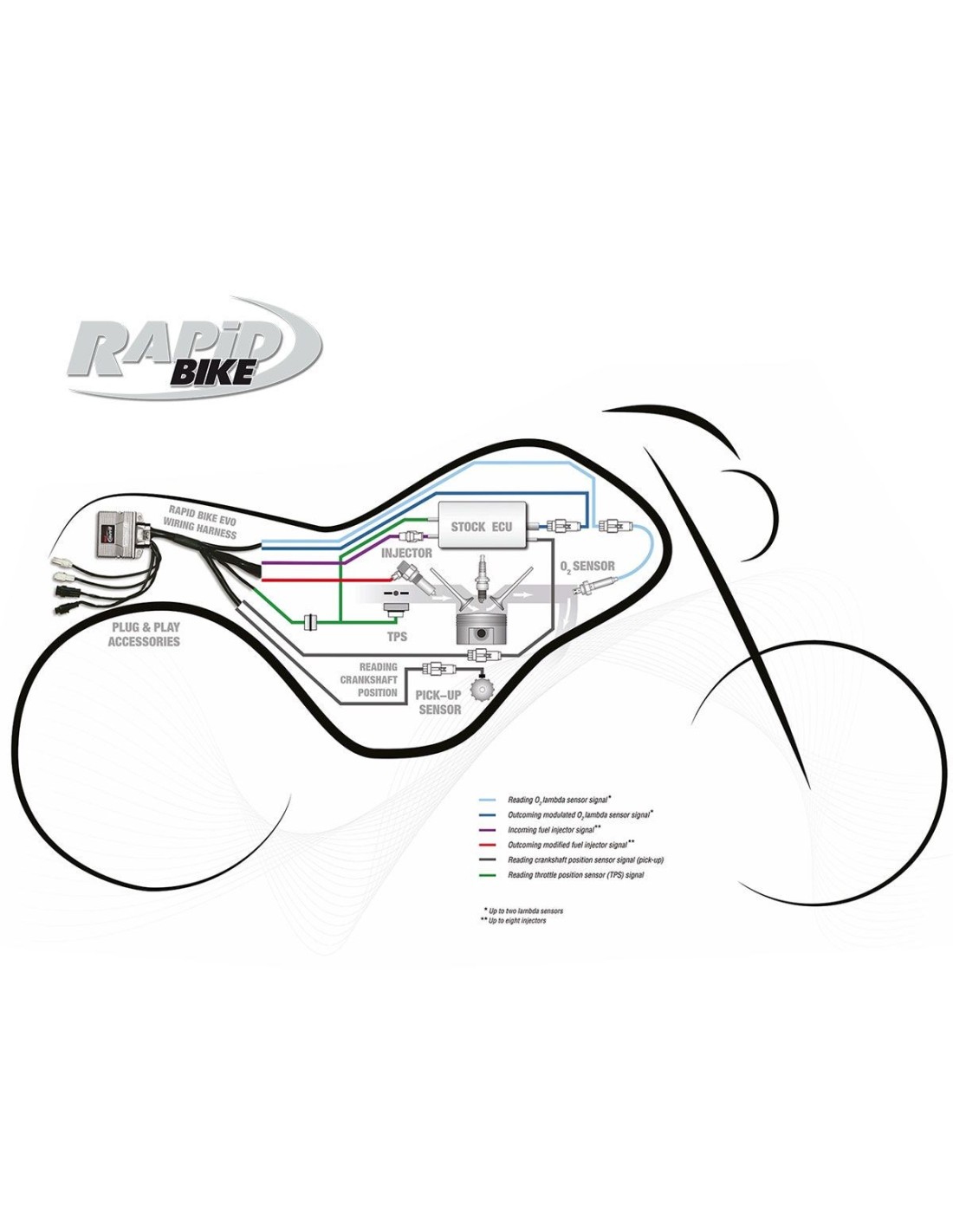 La unidad de control adicional Rapid Bike EVO ofrece un control total de la carburación mediante la gestión de todos los inyectores originales (hasta ocho) y de la relación aire/gasolina, para poder modificar el mapa de inyección a lo largo de toda la curva de funcionamiento del motor sin percepciones de anomalías.