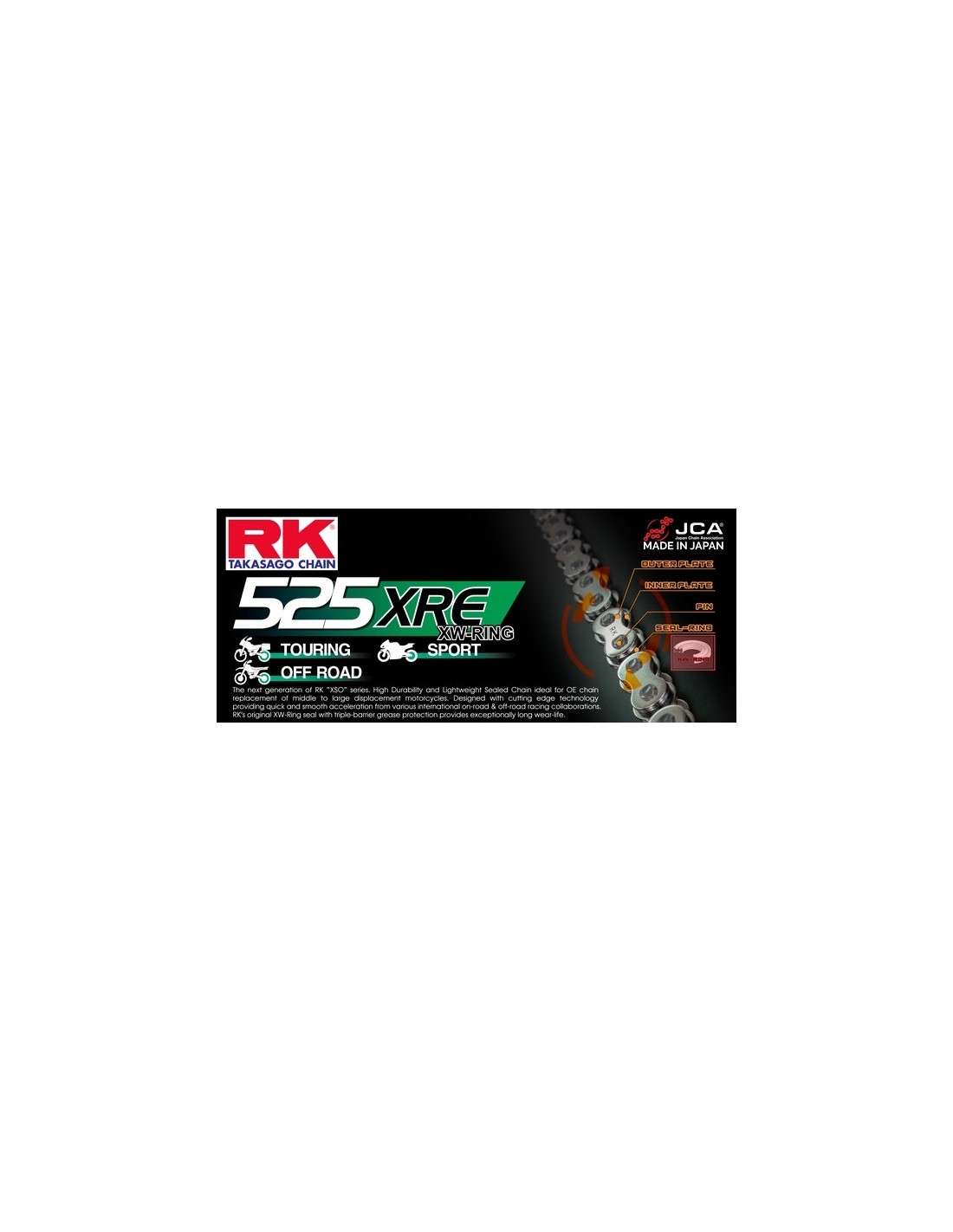 Las cadenas RK XRE cuentan con la única tecnología RK de XW-Ring, que tiene dos piscinas de lubricación y tres labios de contacto, una estructura de triple barrera para sellar aún más la lubricación y evitar que entren residuos en la cadena. La durabilidad se ha mejorado con respecto a la serie XSO.