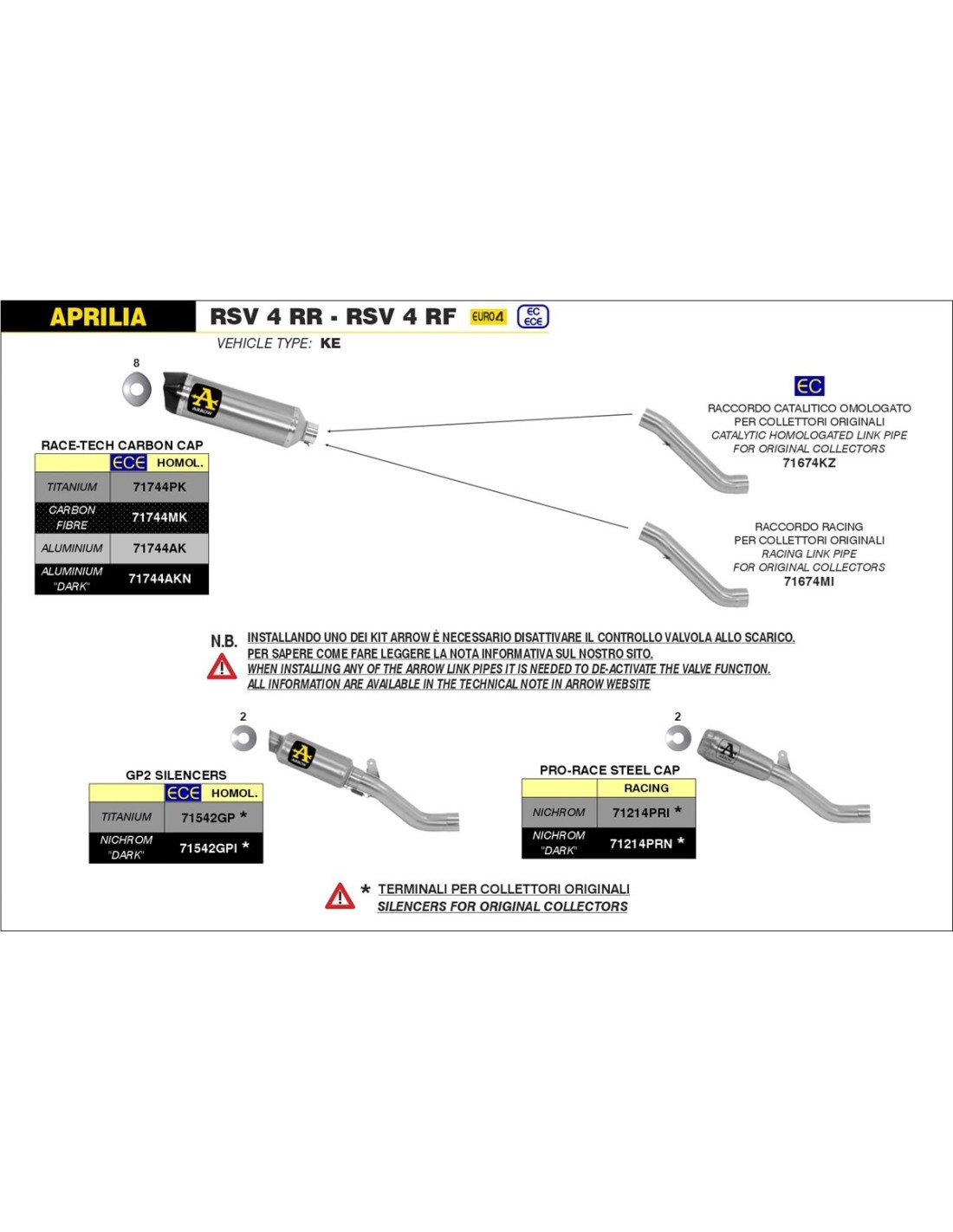 ARROW CONECTOR RACING PARA COLECTORES ORIGINALES 71674MI Tuono V4 1100 RR / Factory '17/18 Tuono V4 1100 Factory '19/20 RSV 4 RR - RSV 4 RF '17/18 RSV 4 1100 Factory '19/20 Conector racing de acero para colectores originales Caracteristicas Valores material del conector acero inoxidable diámetro de entrada (mm) 60,00 diámetro de salida (mm) 60,00 inclusión de la Sonda co NO inclusión de la Sonda Lambda NO inclusión del dB-killer NO Peso (Kg) 0,85
