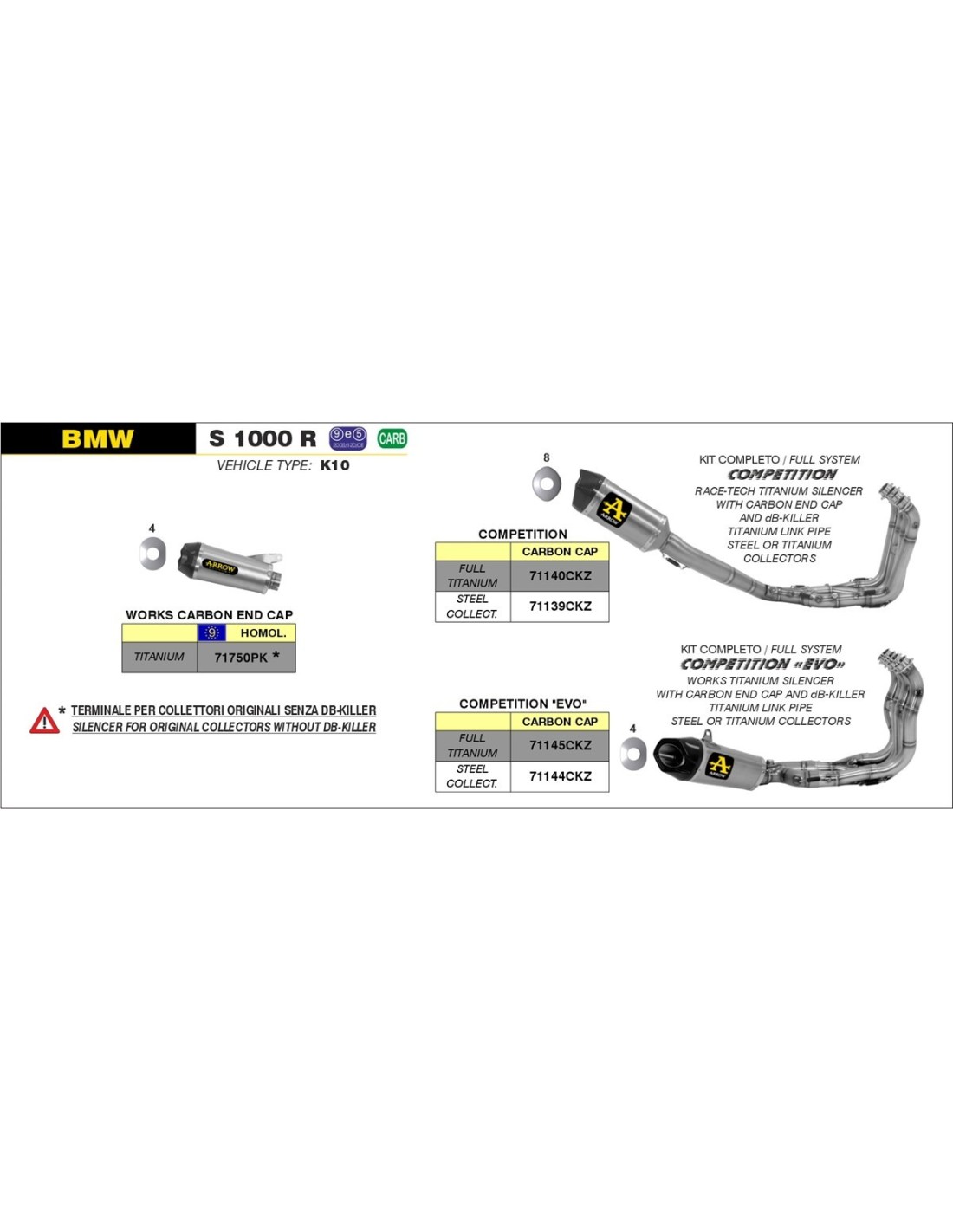 SISTEMA COMPLETO COMPETITION EVO FULL TITANIUN 71145CKZ Sistema completo COMPETITION "EVO Full Titanium" con dBKiller con fondo en carbono Caracteristicas Valores material del cuerpo titanio material del terminal posterior carbono material interno silencioso acero inoxidable material del conector titanio Tipo de fijación silencioso soporte soldado material de los colectores titanio longitud del cuerpo (mm) 250,00 diámetro de entrada (mm) 54,00 diámetro de salida (mm) 58,00 inclusión de la Sonda Lambda SI inclusión del dB-killer SI Peso (Kg) 3,60