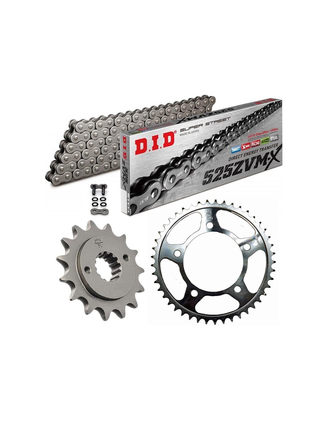 LA FOTO MOSTRADA ES SOLO A MODO ILUSTRATIVO. Caracteristicas Técnicas: Kit completo, cadena, corona y piñón. En desarrollo original de serie. Cadena DID modelo ZVMXGG dorada. Eslabón de Unión. Corona y piñón de la marca JT o Sunstar, según disponibilidad. Cadena con reten en X. DID ZVMX, resistencia a la tracción: Paso 520: 3970 Kgs. Paso 525: 4700 Kgs. Paso 530: 4800 Kgs. SI QUIERES UN DESARROLLO DISTINTO AL DE SERIE, INDICALO AL HACER EL PEDIDO.