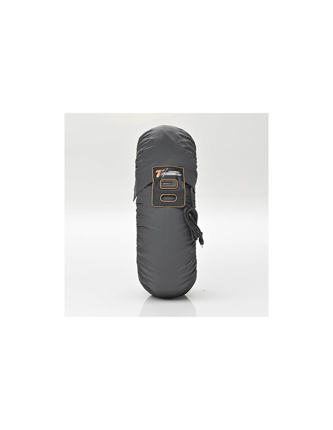 Calentador de neumáticos para carreras de motos con temperatura controlada electrónicamente desde la centralita insertada en el tirante. Permite el ajuste en tres niveles preestablecidos, 50ºC - 90ºC - 110ºC con indicador LED y tecla de selección. Confeccionado con tejido exterior engomado, tejido interior ignífugo y faldones de neopreno.