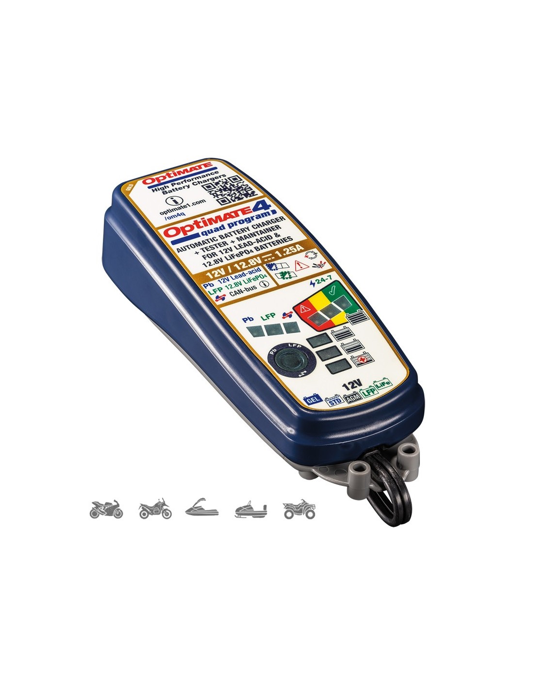 Adecuada para todos los tipos de baterías deportivas de 12V, incluidas las de plomo-ácido (Pb)>STD (con tapones de sellado), AGM y GEL (VRLA sellada) y Li-Ion fabricadas con tecnología LiFePO4/LFP