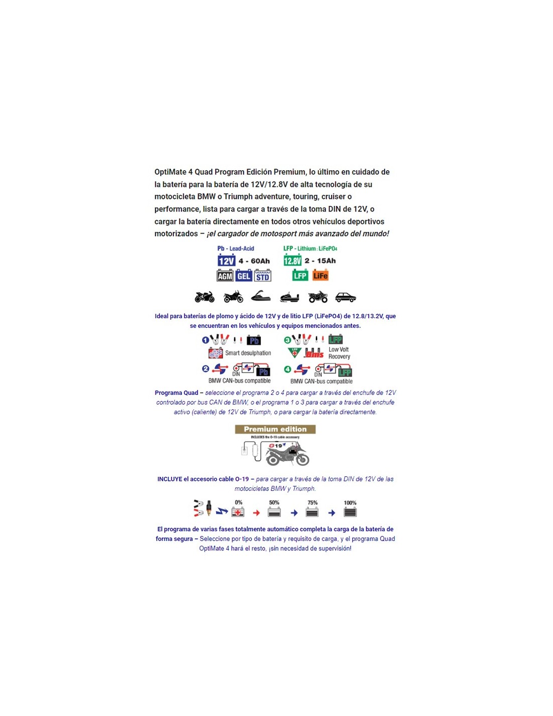 OptiMate 4 Quad Program Edition es el cargador de batería definitivo para motocicletas BMW o Triumph de aventura, turismo, crucero o rendimiento, listo para cargar a través de la toma DIN de 12V