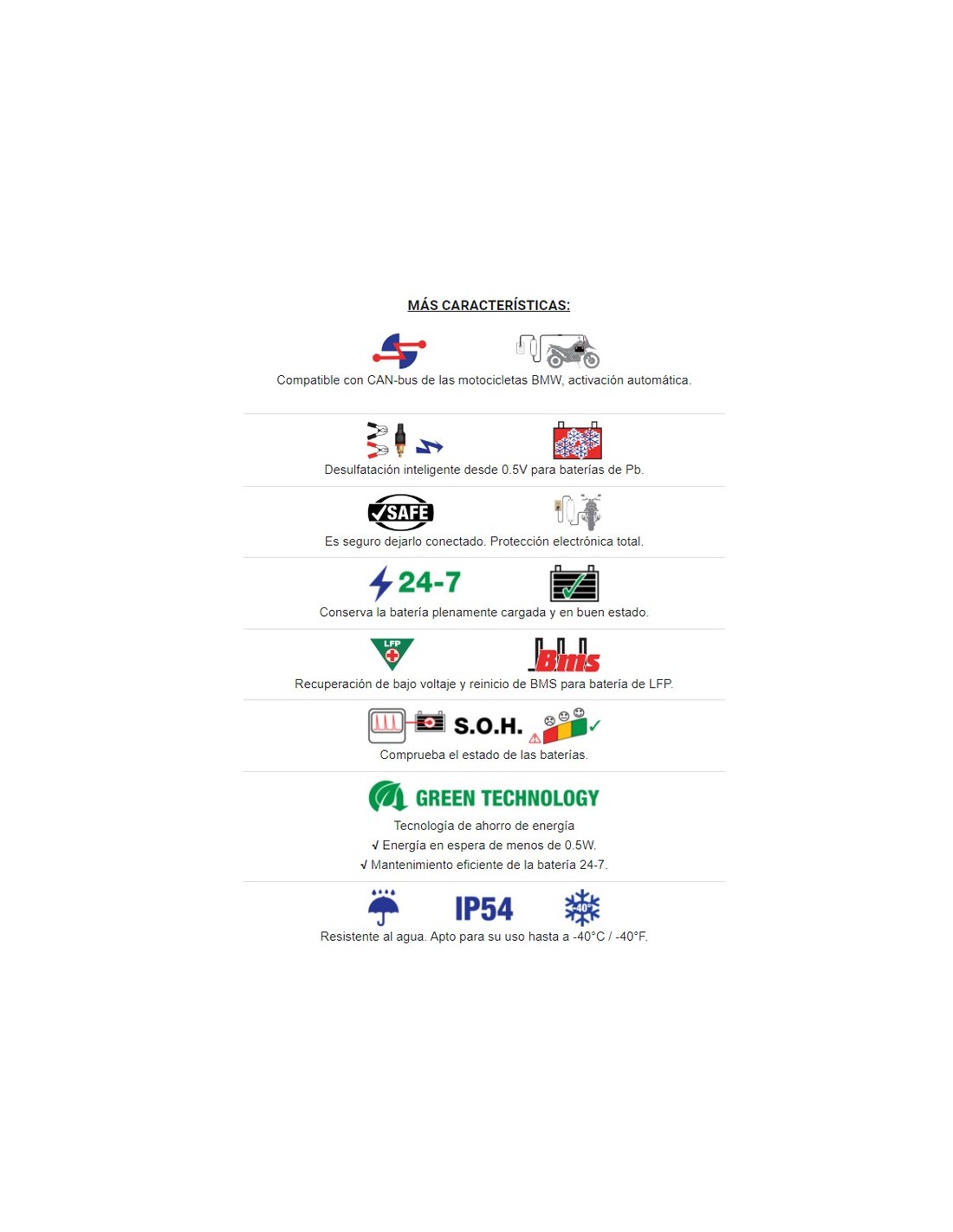 SEGURIDAD: no existe riesgo de sobrecarga. Completamente seguro para la electrónica del vehículo. Supresión de chispas. Seguro para el mantenimiento de la batería a largo plazo. Apagado automático en caso de cortocircuito o desconexión de la batería.