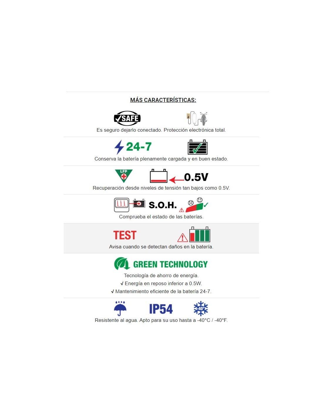 SEGURIDAD: sin riesgo de sobrecarga. Totalmente seguro para el sistema electrónico del vehículo. Supresión de chispas. Seguro para el mantenimiento de la batería a largo plazo. Desconexión automática cuando se cortocircuita o se desconecta la batería.