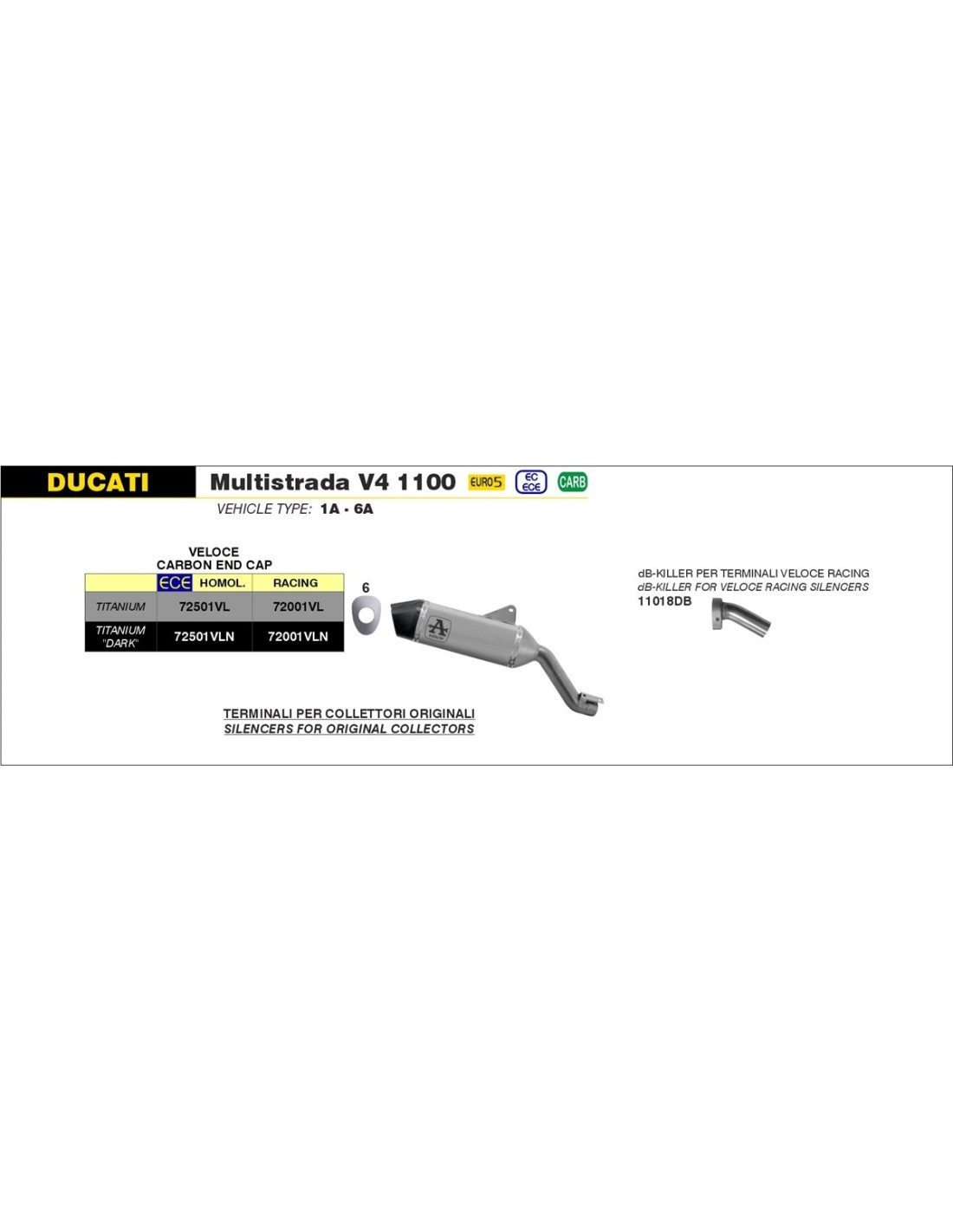 ARROW SILENCIOSO VELOCE VELOCE COMPACTA, VERSATIL Y EXTREMADAMENTE Arrow VELOCE es la nueva referencia en el desarrollo de silenciadores compactos y versátiles. Capaz de liberar la máxima energía sin comprometer volúmenes y pesos. Su diseño compacto “lágrima” es perfecto para integrarse con las últimas exigencias estilísticas y su terminal romboidal caracteriza un sonido único y profundo en todo el régimen. Los espesores de las lamas de titanio sufren un tratamiento superior para poder ser reducidas a valores de extrema ligereza. Arrow VELOCE es totalmente nuevo pero contiene una historia única, completamente italiana, que ha entusiasmado a motociclistas de todo el mundo desde 1985.