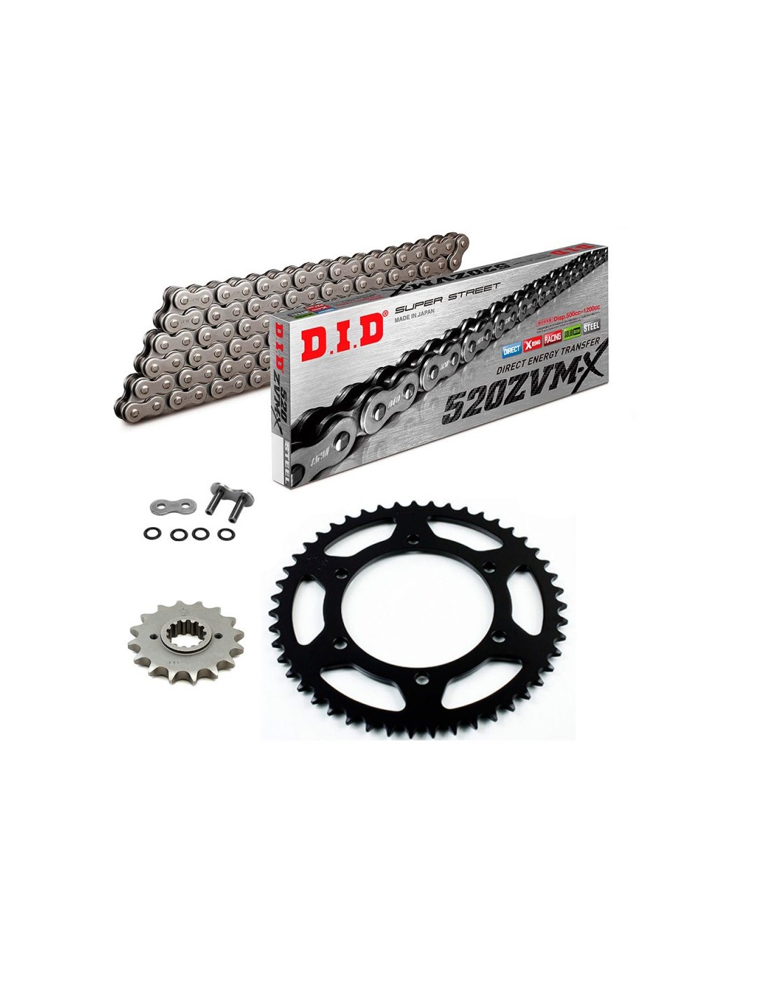 LA FOTO MOSTRADA ES SOLO A MODO ILUSTRATIVO. Caracteristicas Técnicas: Kit completo, cadena, corona y piñón. En desarrollo original de serie. Cadena DID modelo ZVMXGG dorada. Eslabón de Unión. Corona y piñón de la marca JT o Sunstar, según disponibilidad. Cadena con reten en X. DID ZVMX, resistencia a la tracción: Paso 520: 3970 Kgs. Paso 525: 4700 Kgs. Paso 530: 4800 Kgs. SI QUIERES UN DESARROLLO DISTINTO AL DE SERIE, INDICALO AL HACER EL PEDIDO.
