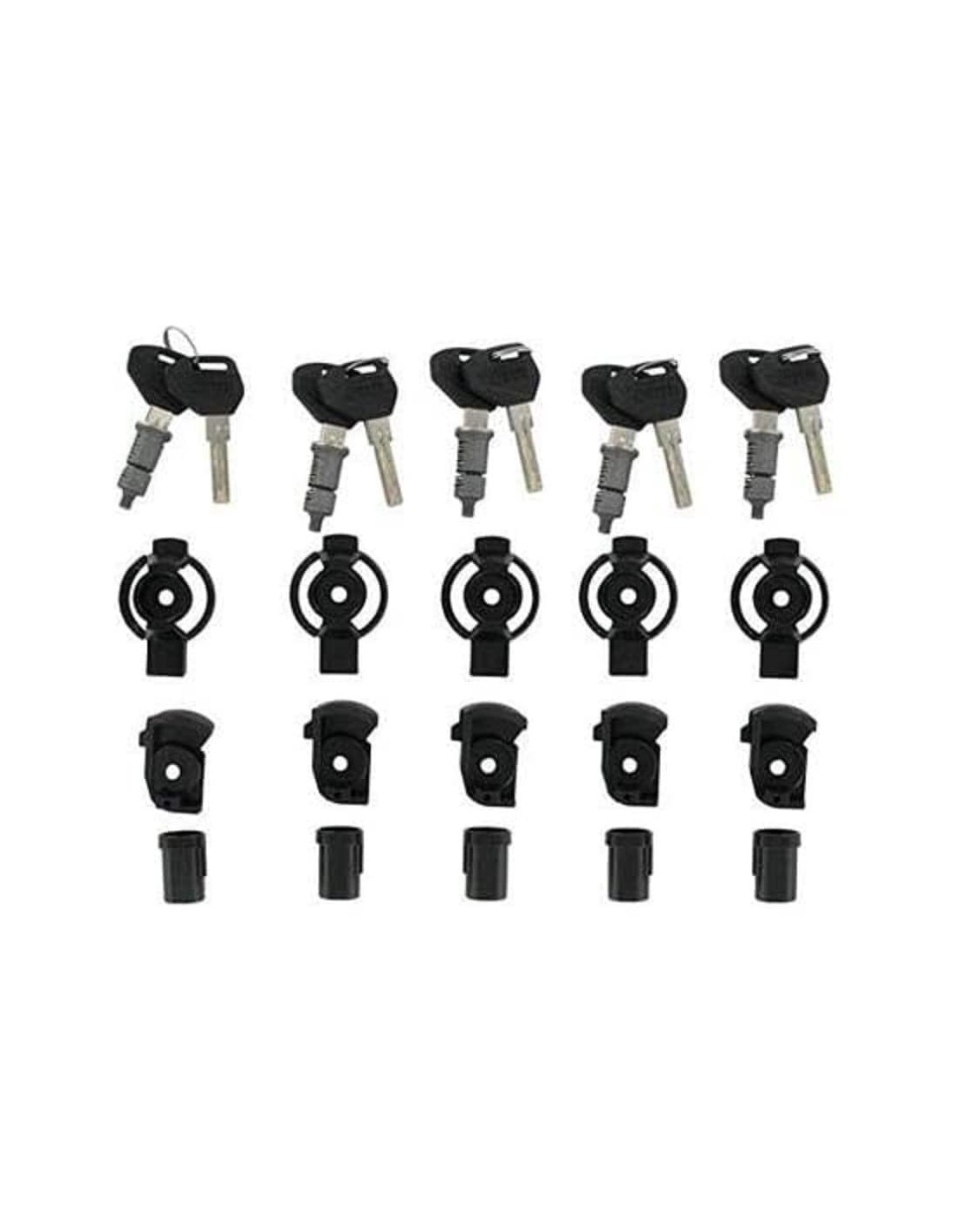 Kit de unificación de llaves Security Lock para 5 maletas, incluye casquillos. Compatible únicamente con carcasas que tengan el cilindro de bloqueo de seguridad instalado de serie. Para utilizarlo en maletas que tengan el Security Lock como opcional, es necesario adquirir también la placa correspondiente debajo del cierre.