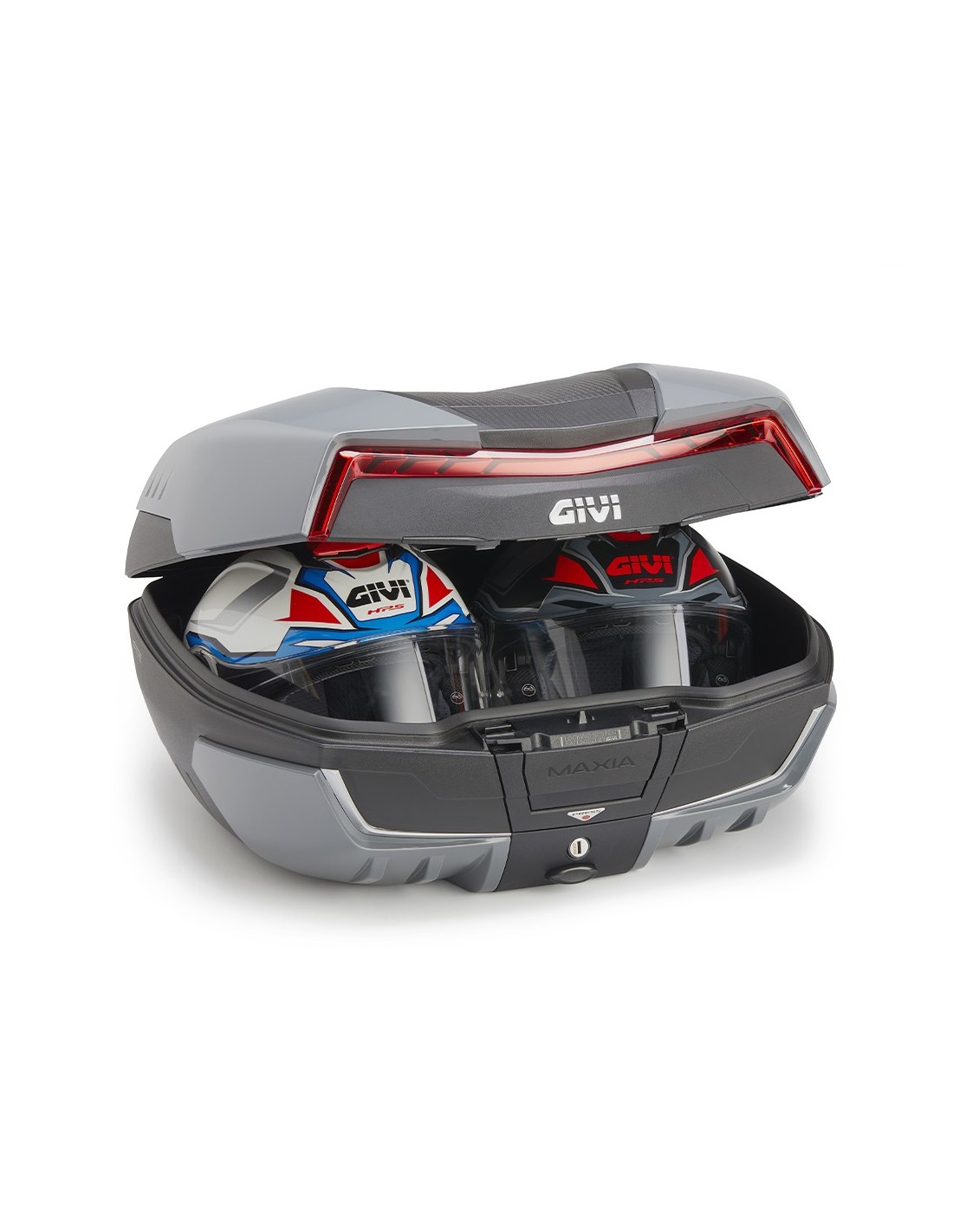 La maleta Maxia 5, especialmente pensada para las personas que adoran hacer viajes largos en moto, en solitario o con compañía, tiene espacio para 2 cascos modulares de grandes dimensiones.