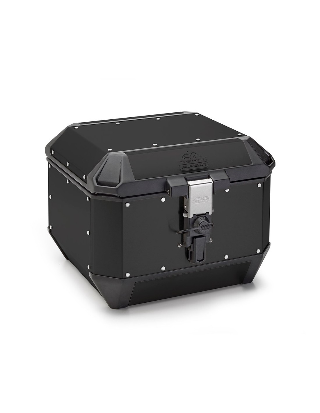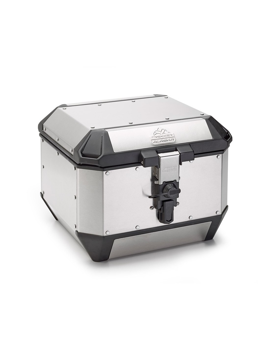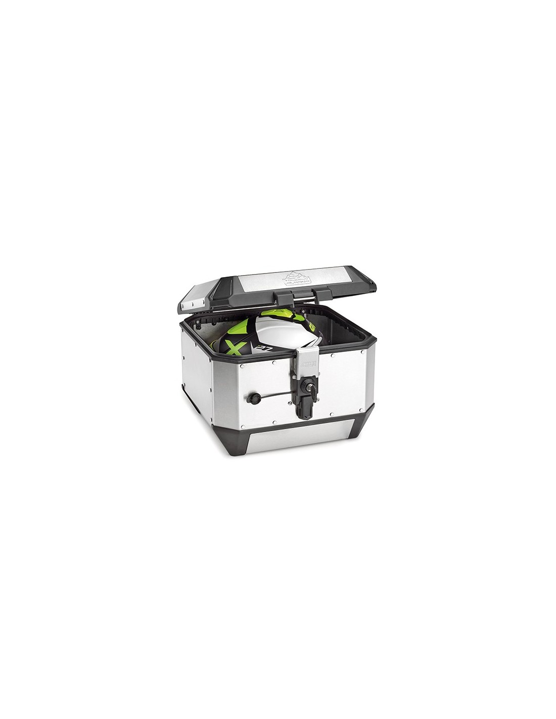 La maleta posterior de moto Trekker Alaska de aluminio natural, 44 L.. Puede albergar un casco modular. Dotada del sistema de fijación MONOKEY®, que permite utilizar la misma llave para la cerradura, la apertura y el desenganche de la parrilla. Compatible con todas las parrillas Monokey, excepto las que están dotadas de contacto para el kit de luz de stop.