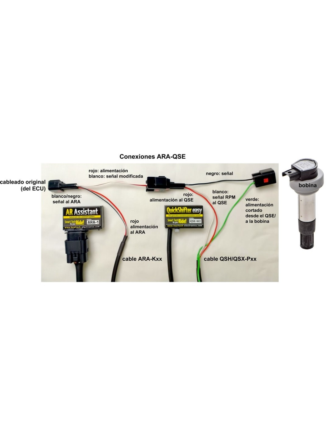 Si su moto precisa un cableado QSE tipo QSH-Pxx a las bobinas, el cableado ARA-Kxx se instala entre el cableado original de la moto (ECU) y el cableado QSH, NO entre el cableado QSH y la bobina.