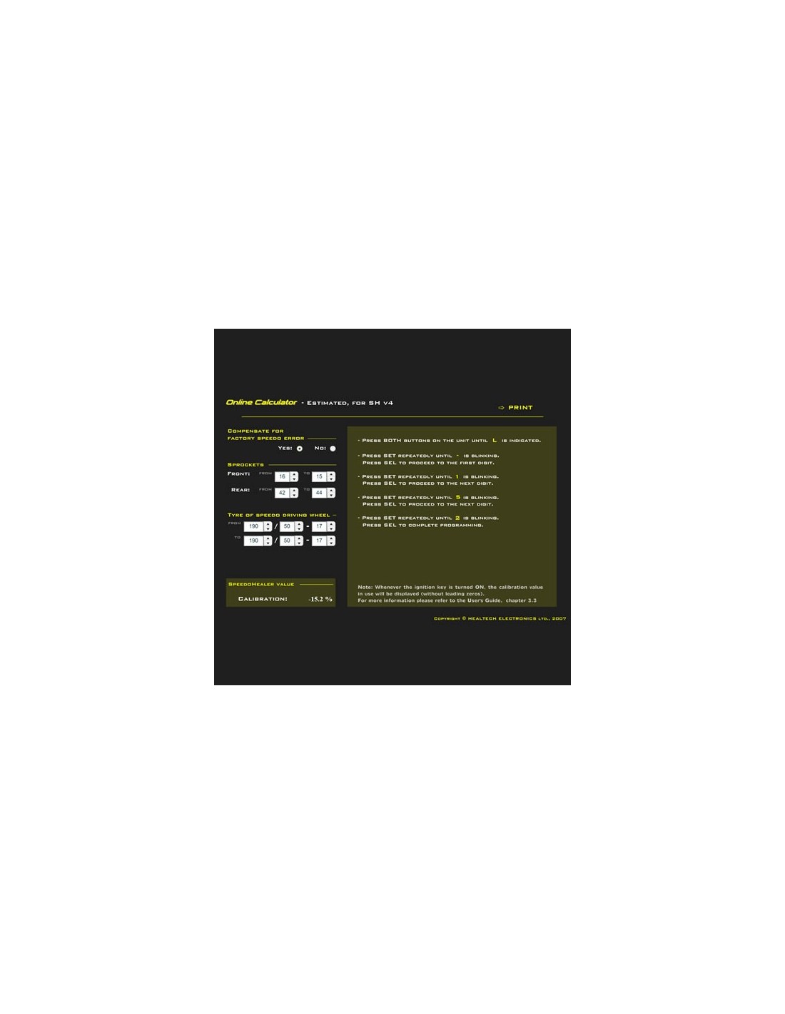 Un SpeedoHealer le permite calibrar el velocímetro/odómetro y corregir tanto el error inherente de fábrica como el desfase causado por cambiar el desarollo (piñón/corona/rueda).