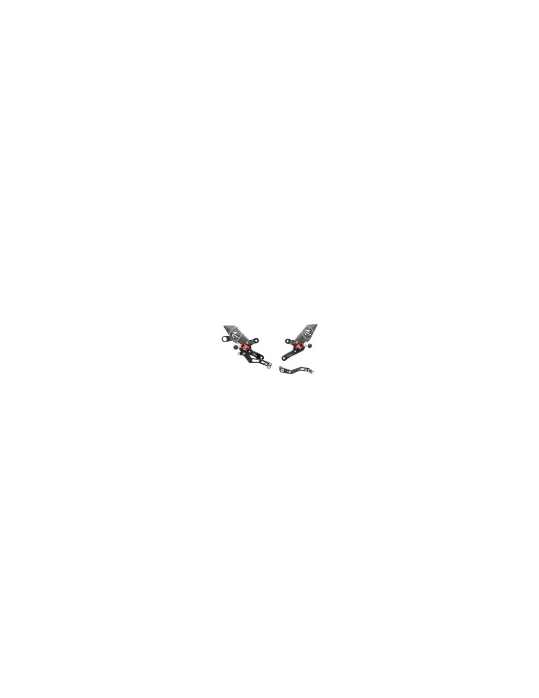 Estribera retrasada versión R, reposapiés y puntalino abatible, protector en carbono, tornillería en titanio, soportes en rojo.