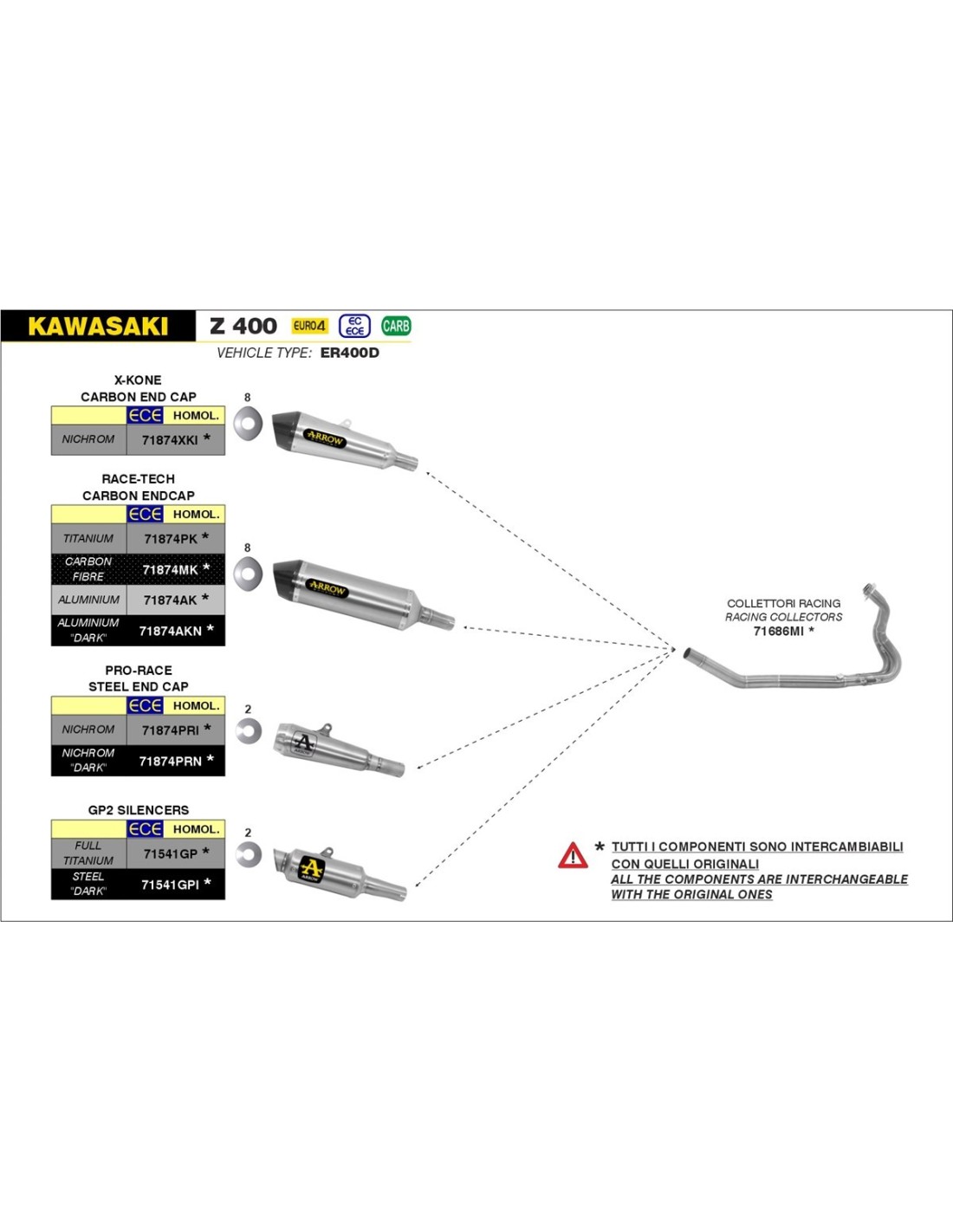 El silencioso Race-Tech fue el primer escape fabricado con forma de diamante que en los últimos años ha sustituído “el estilo antíguo” de escapes tradicionales de forma cilíndrica o elíptica. La forma innovadora del diseño de diamante hizo que Arrow fuera capaz de reducir las medidas de la forma tradicional, manteniendo los mismos esquemas. Esto le permitió a Arrow disminuir el peso sin afectar el volumen interno y conservar los niveles de ruído dentro de los límites aceptables sin interferir con las prestaciones. Los componentes internos de los silenciosos están producidos en acero inoxidable y acoplados con soldaduras de tecnología TIG. Todas las secciones “húmedas” (aquellas por donde hay flujo de gas) se mantienen bajo un estricto control dimensional para optimizar el flujo de gas. Una característica muy importante es la terminación posterior y la salida de los gases: estos componentes están diseñados para optimizar la salida del flujo de gases libre de turbulencias, reduciendo los efectos negativos de la presión. Los silenciosos de la línea Race-Tech están disponibles en la versión de homologados para casi todas las motos. Estos silenciosos se fabrican en titanio, fibra de carbono o en aluminio. Para algunas motos el silencioso de titanio también está disponible con la nueva terminación en fibra de carbono