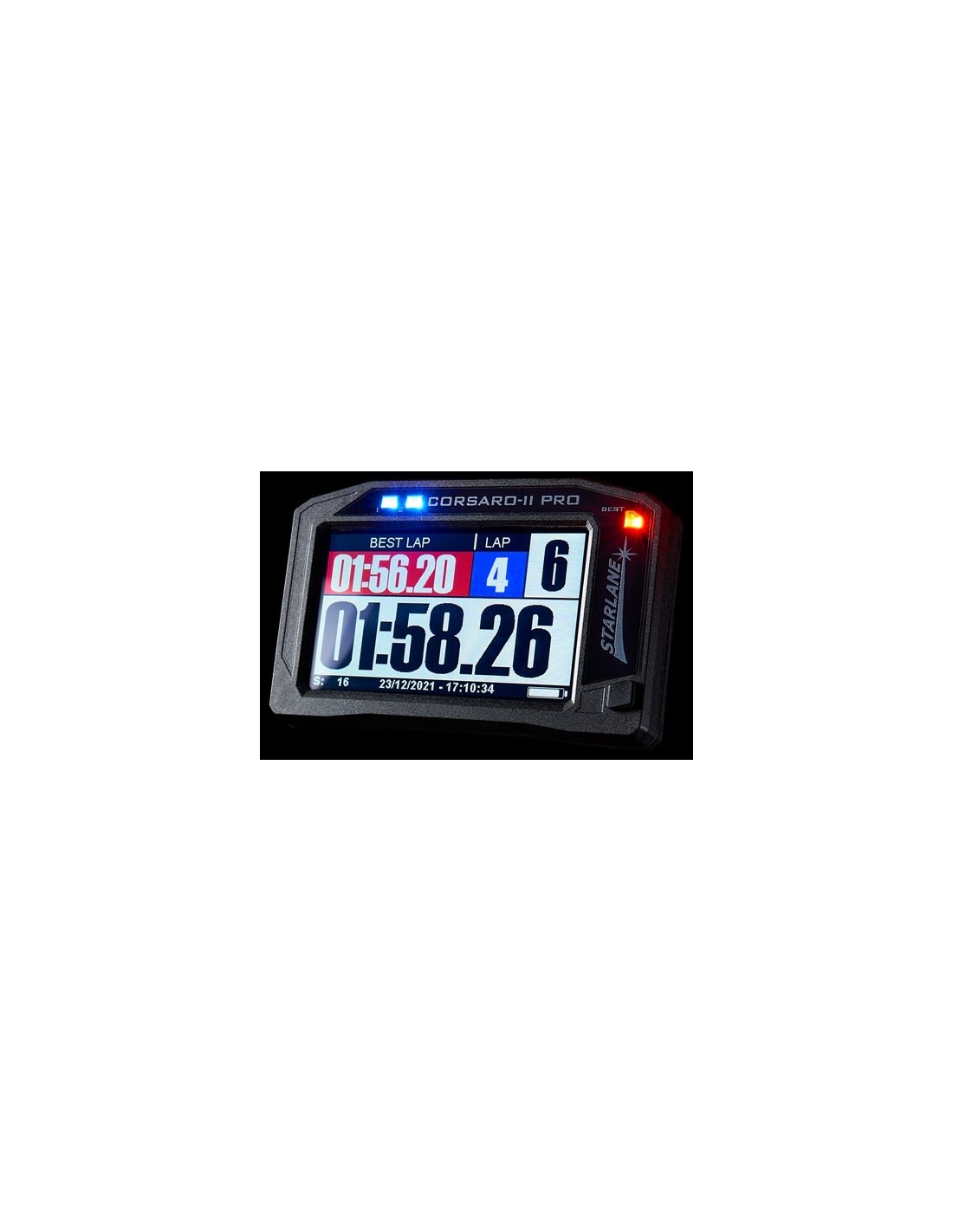 Cronómetro GPS, Glonass y Galileo con pantalla táctil color LCD y conexión bluetooth y WIFI. Puede ser conectado de manera inalámbrica a los módulos opcionales de sensores WID. Suministrado por la casa con Inertial Pack para ángulo de inclinación y aceleración lateral y longitudina