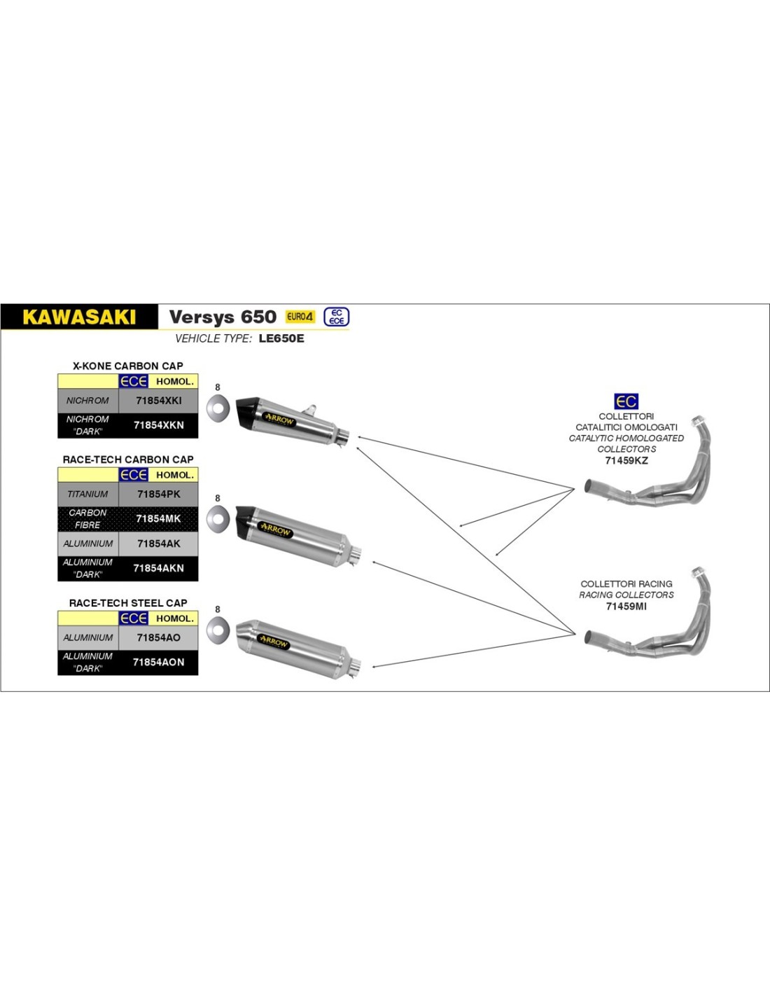 Arrow presenta la nueva linea de silenciosos X-Kone. Los silenciosos X-Kone han sido desarrollados en un principio para ser utilizados en algunos escapes de la linea Competition y Competition “Full Titanium” y ahora , con el nuevo Terminal en carbono, están también disponibles para las Naced deportivas de cilindrada media, en versión homologada, con dB-killer extraíble. El ruido está bajo control por absorción, para aligerar la estructura interna. Los interiores son en inox y el cuerpo de los silenciosos en Nichrom satinado.