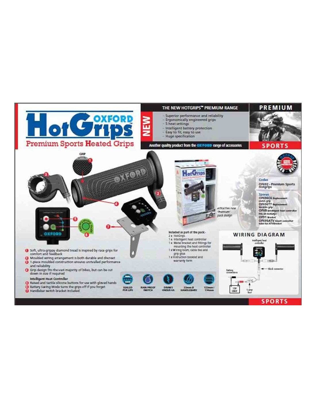 La estructura de la superficie de los puños calefactables ha sido diseñada ergonómicamente para optimizar el rendimiento en conducción. Suave, ultra-adherente con un tacto confortable y progresivo gracias a su forma en diamante inspirado en carreras. La longitud de agarre es de 123 mm, pero puede ser recortado a 114 mm, y tiene los extremos abiertos de manera que los pesos finales puedan ser instalados.