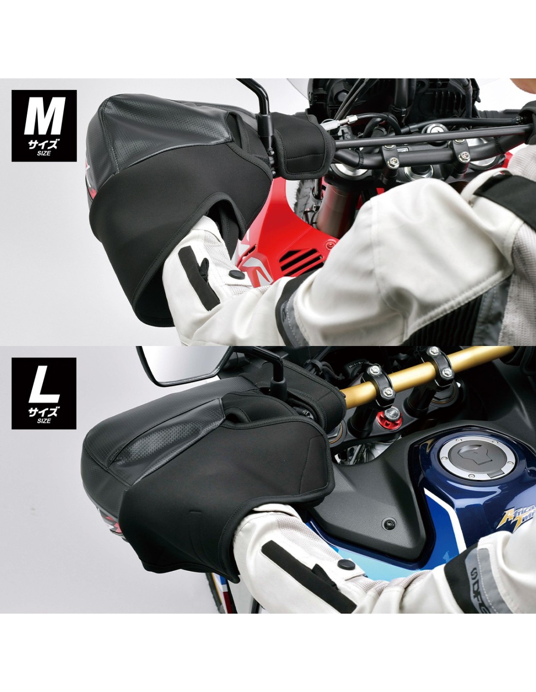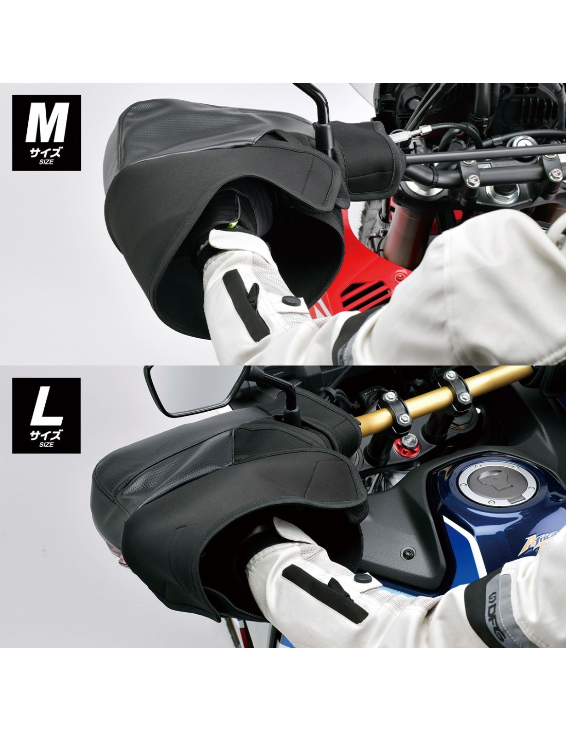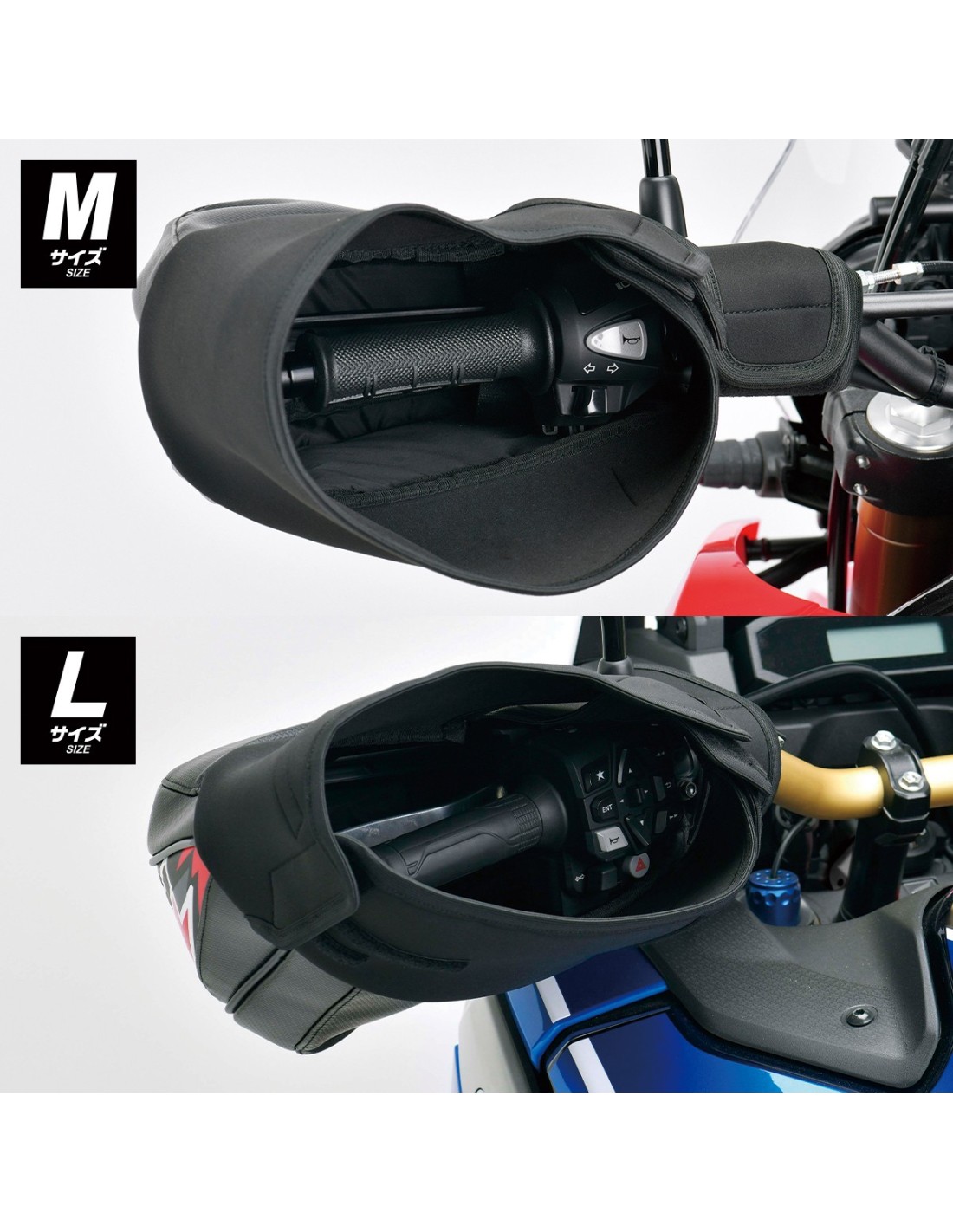 - Disponible en tamaño M y L estándar para adaptarse a protectores de manos grandes y protectores de manos de serie de motos de aventura grandes como Africa Twin y Ténéré.
