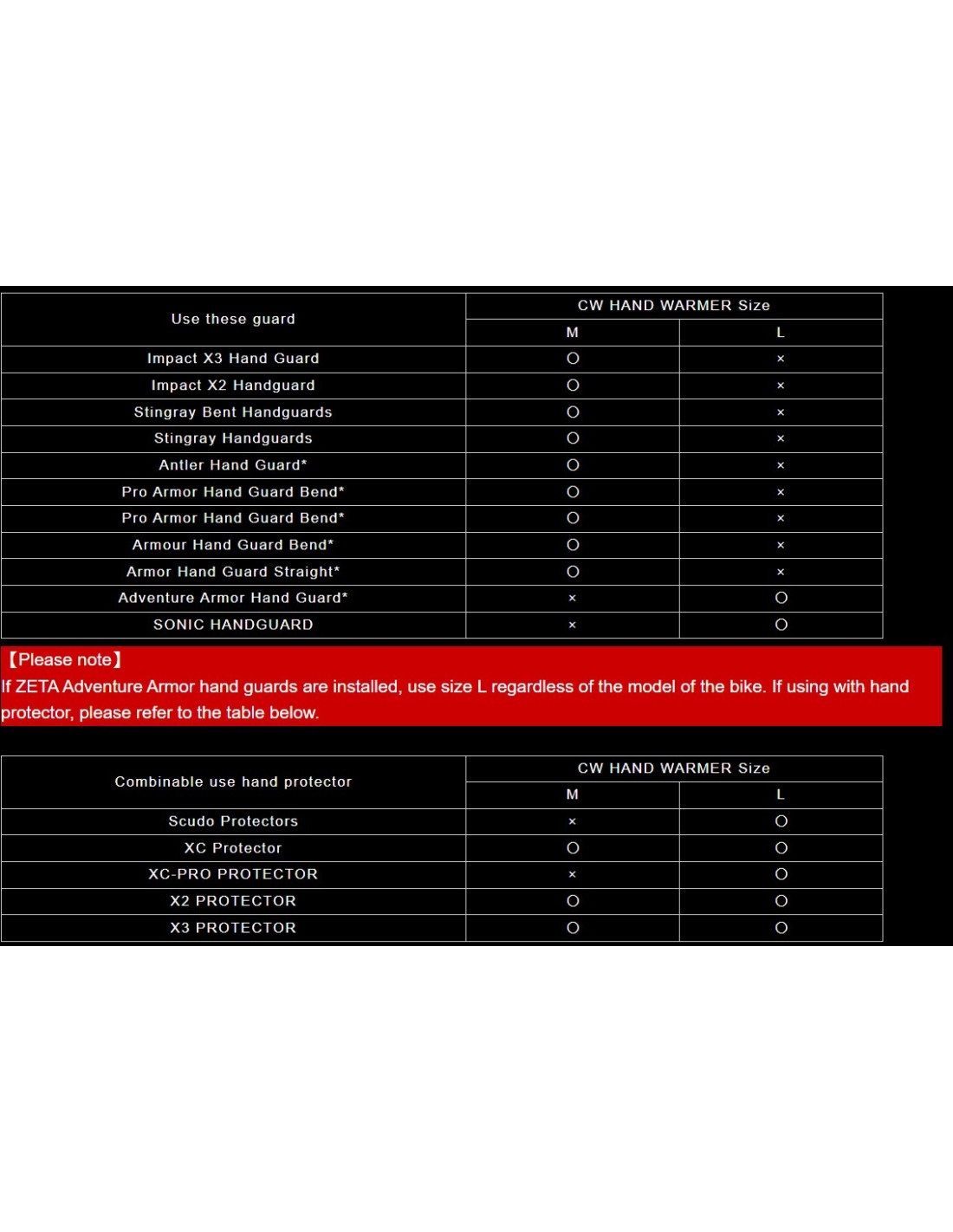 - Consulte la tabla de compatibilidad para protectores de manos y protectores de manos ZETA.
