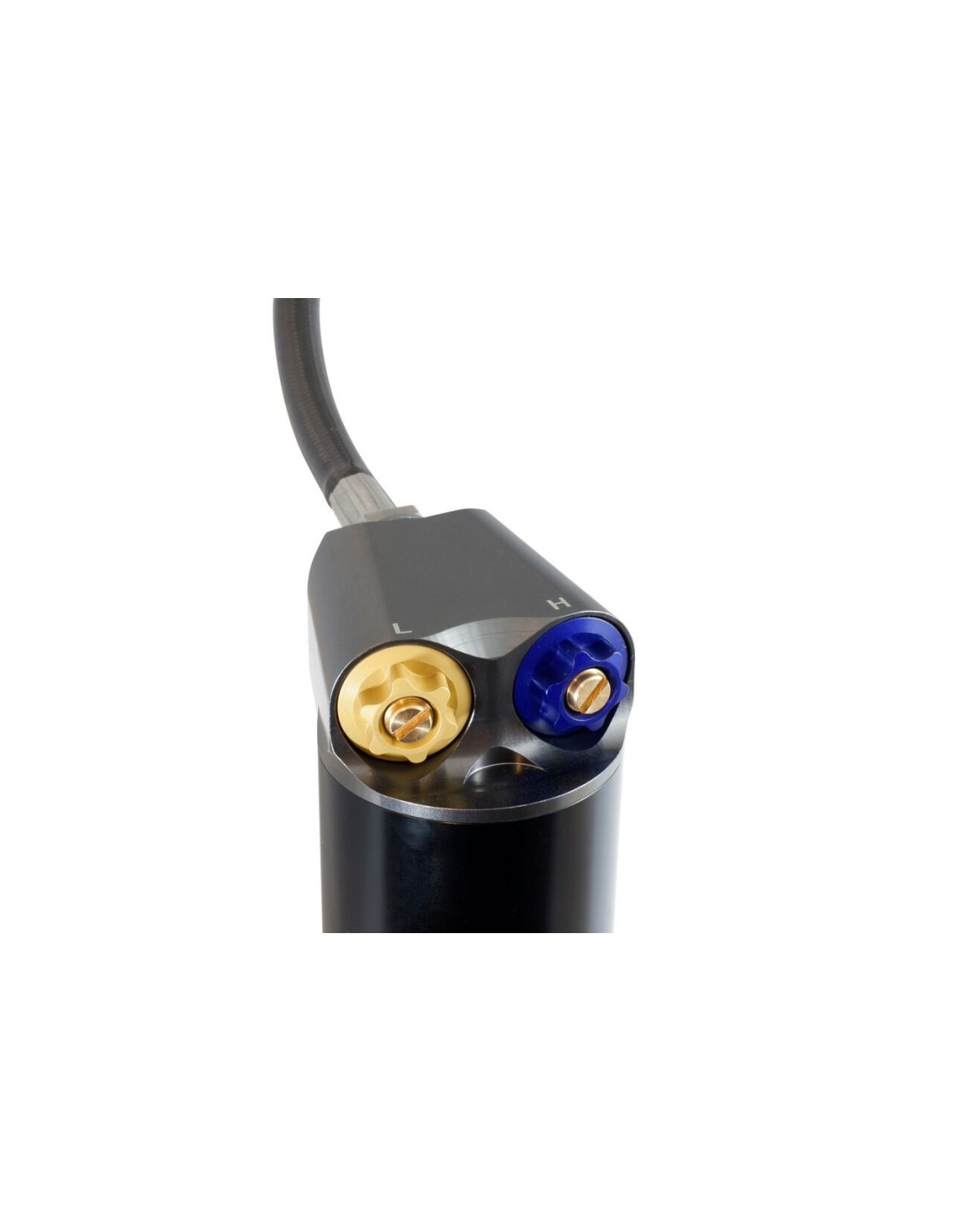 Amortiguador completamente ajustable con depósito remoto conectado con un manguito.