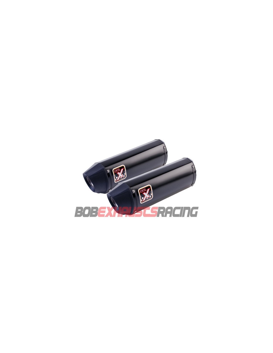Silenciador fabricado en acero inoxidable AISI 304 con acabado lacado negro. Tapa salida cónica asimétrica, fabricada en polímero de altas prestaciones, de color negro.