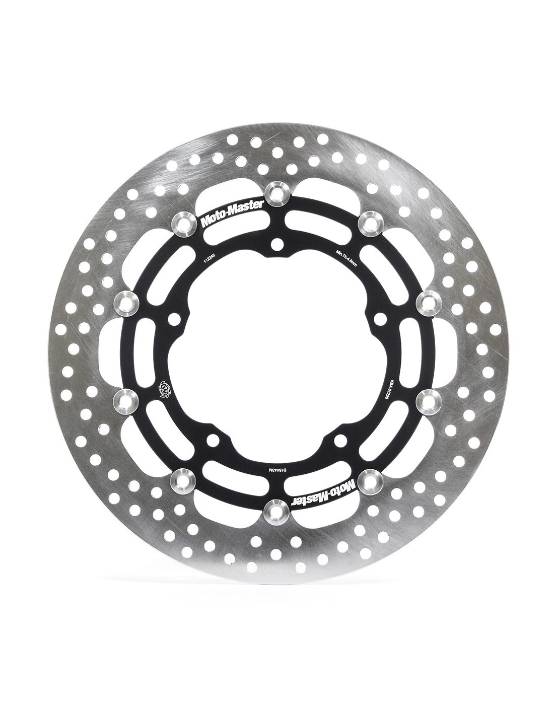 MOTORCYCLE MSTER FLOATING DISC HALO SERIES RACING 112205 Moto-Master HALO 5.5 competition discs are TÜV/ABE approved, making them an excellent multi-purpose choice for the serious professional rider. The exact size and position of the ventilation holes ensure equal heat dispersion under high heat stress, while the contact surface of the brake pads is cleaned evenly. The laser cut and precision ground outer ring is attached to a CNC machined, black anodized and laser marked aircraft aluminum bracket. Newly designed stainless steel floats complete the ensemble. The laser cut and precision ground outer ring is attached to a CNC machined, black anodized and laser marked aircraft aluminum bracket. For best performance we recommend using Moto-Master brake pads. All Moto-Master discs are TÜV approved.