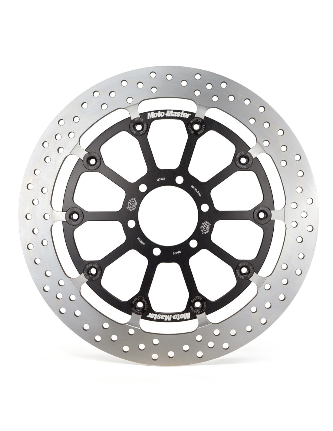 MOTORCYCLE MSTER FLOATING DISC T-FLOATER HALO RACING SERIES R1 2015- R6 2017- The Halo outer ring design ensures equal heat dispersion under high thermal stress conditions while the brake pad contact surface is cleaned evenly. Outer ring thickness 6.0mm (320mm) with an additional cooling groove on the outer perimeter. The laser cut and precision ground outer circumference attaches to a black anodized CNC machined billet aircraft aluminum bracket and laser market The T-Floater system ensures a fully controlled precise floatation action in the most extreme racing conditions. The groove design of the T-Floater pins ensures a very high mechanical load while minimizing wear. The T-Floater system is lightweight thanks to specially designed hard anodized aluminum pins. Diameter Outer 320mm, Diameter Inner 132mm, Thickness 6.0mm
