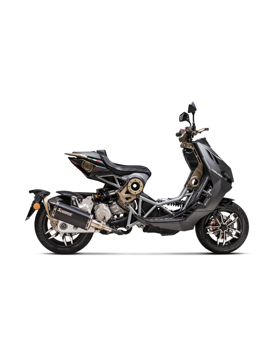 Italjet Dragster 250 2021 2022 2023 2024 A stainless steel link pipe and a hand-crafted carbon fiber end cap complete the design, offering a sporty look in keeping with the futuristic lines of this "urban superbike". Its impeccable throttle response and a weight saving of 35.6% (1.8 kg) compared to the stock system improve the exhaust's performance. It offers a power gain of +0.7 kW (1.0 hp) at 10,200 rpm and a torque increase of +0.7 Nm at 10,200 rpm, measured on the Akrapovič dyno against a 200cc Dragster with a stock exhaust system.