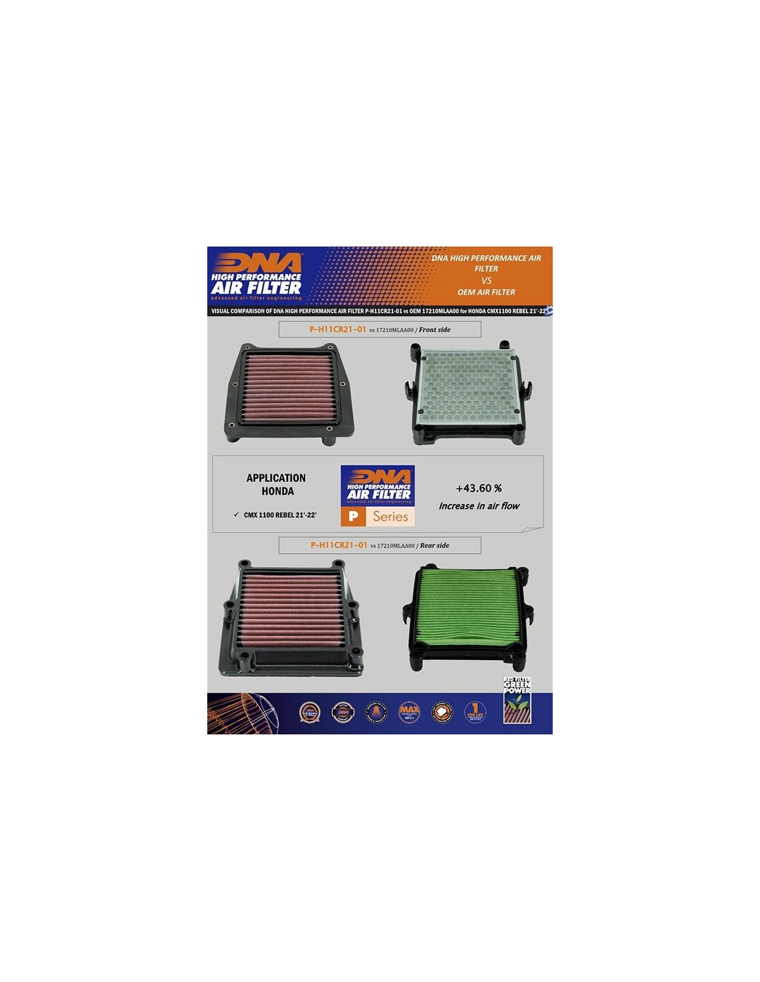 The flow of this new DNA filter is +43.60% more than the stock filter!