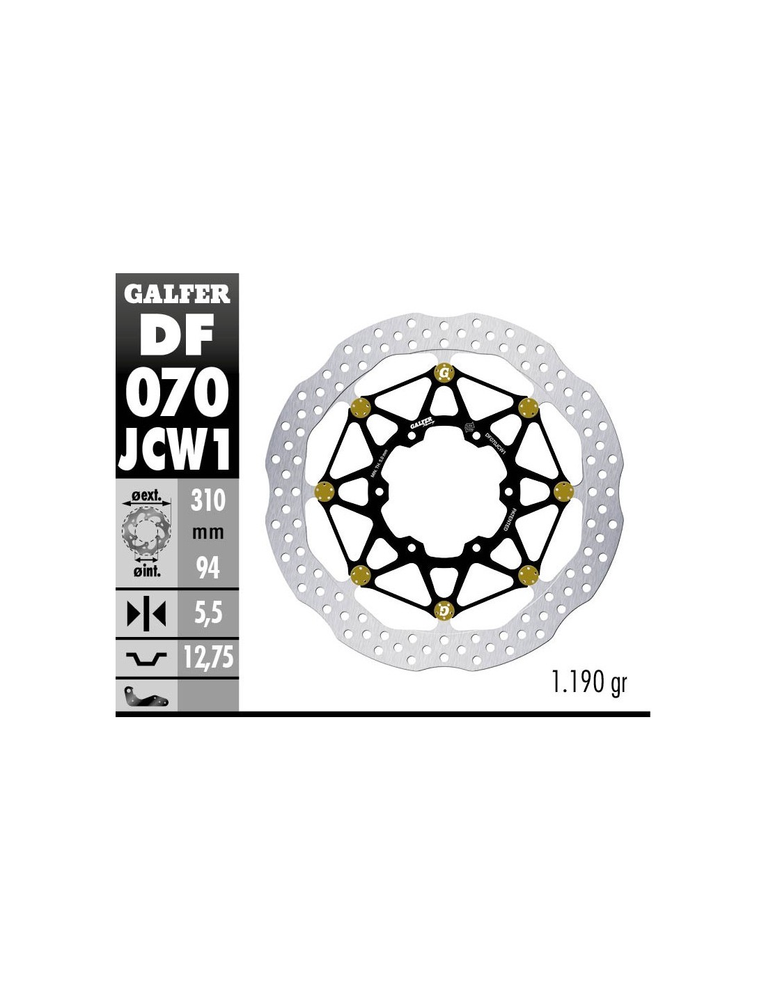 This is Galfer's JCW1 competition brake disc. It features a brake track made of high-carbon, laser-cut stainless steel, while the core is made of high-strength aluminum (7075 T6 - 6082 T6) to offer high strength and significantly reduce the disc's weight.