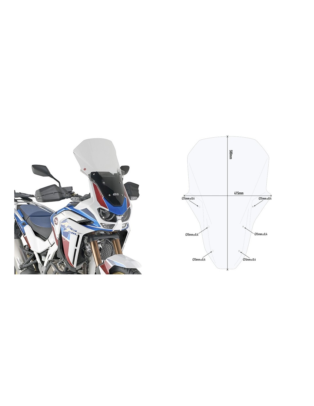 Specific transparent windshield, 58 x 41.5 cm (height x length), to be mounted in place of the original windshield / 5 cm higher than the original