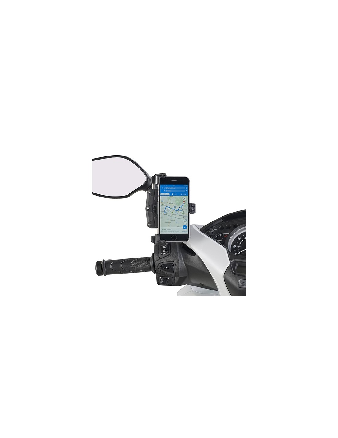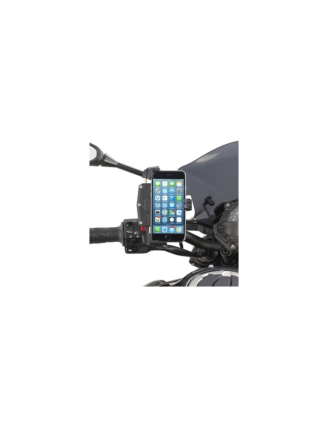 Universal smartphone holder clamp for mounting on motorcycles, scooters, bicycles, and quads. For smartphones with external dimensions: minimum 112 x 52 mm - maximum 148 x 75 mm.