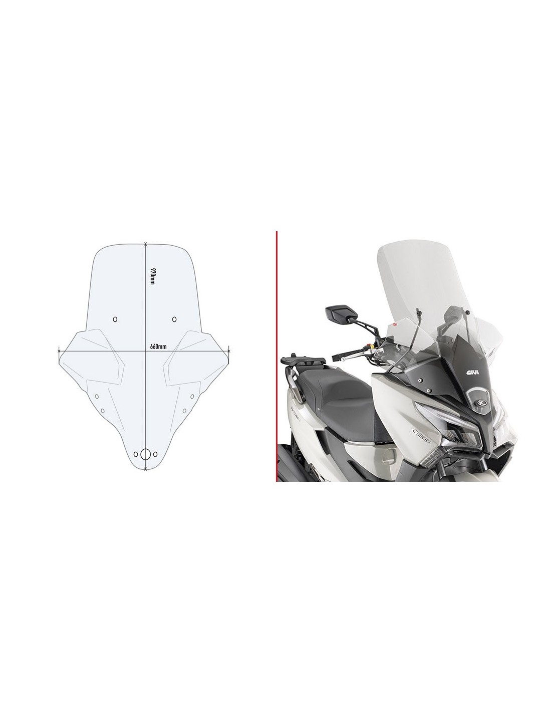 Specific clear windscreen measuring 97 x 66 cm (height x width) for use with mounting kit D6115KIT / 29 cm taller than the original